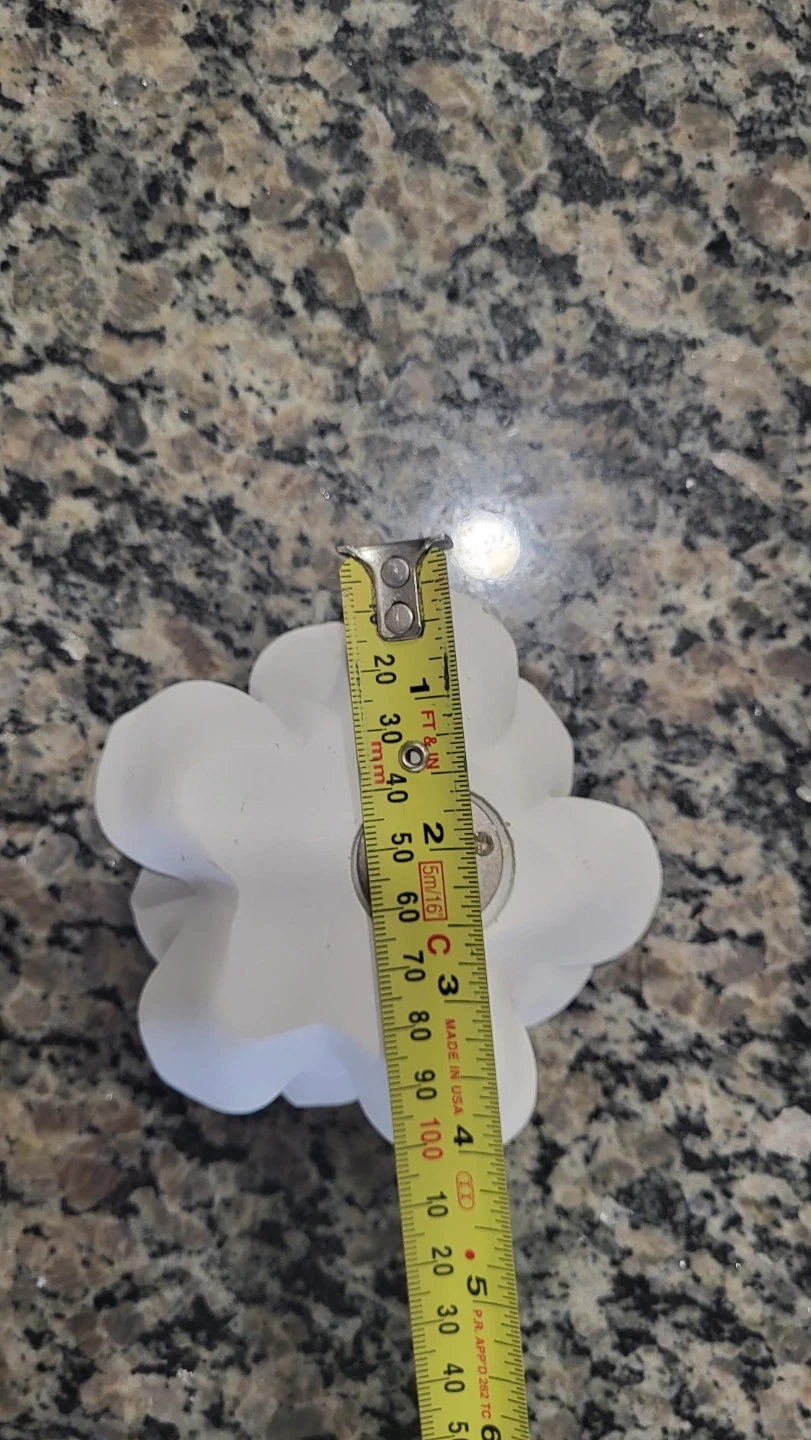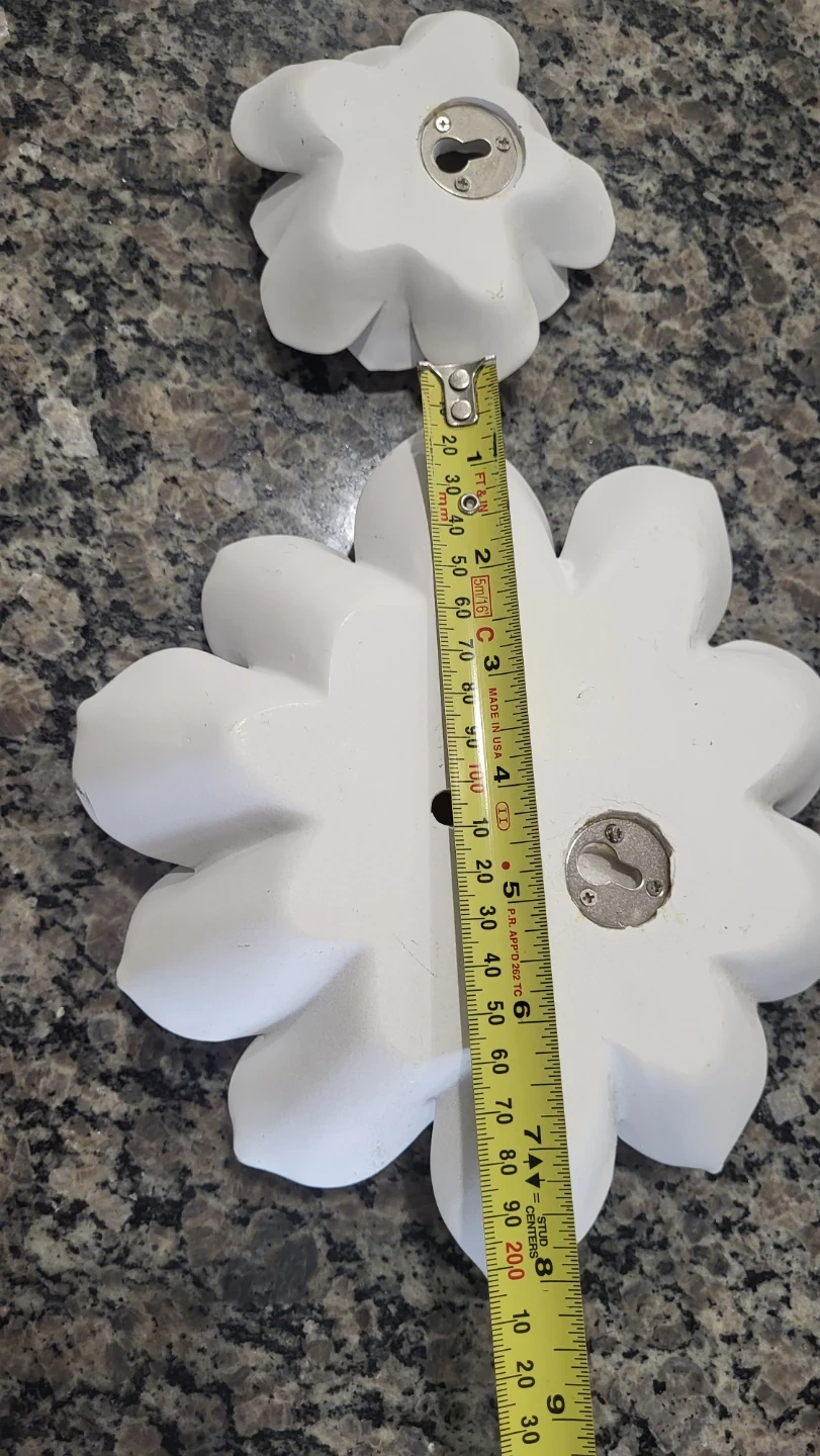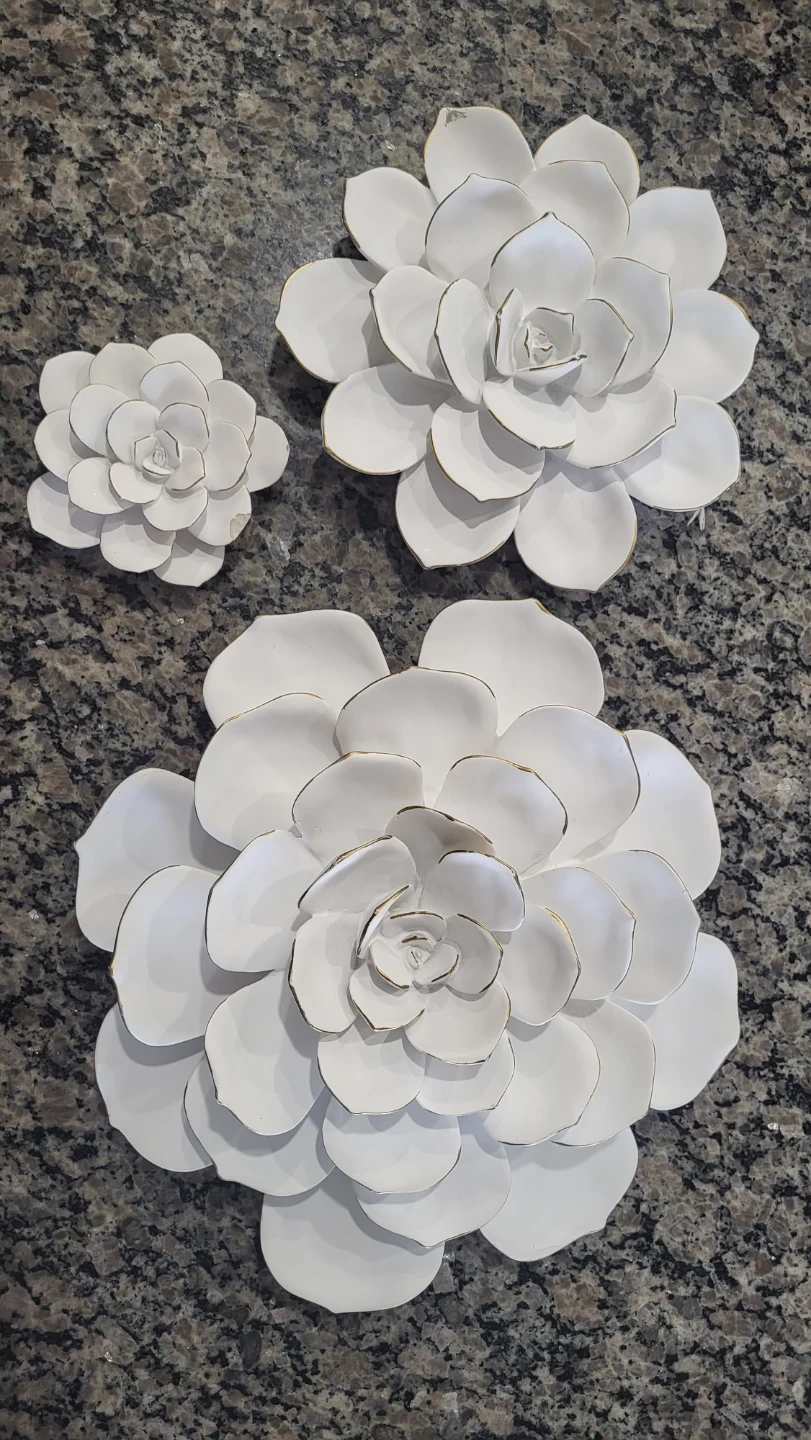 This set includes three white succulent-shaped wall art pieces, each with a delicate gold trim. The largest piece measures approximately 12 inches in diameter, with two smaller pieces included. They're designed for wall mounting. These decorative pieces add a touch of floral elegance to any room!