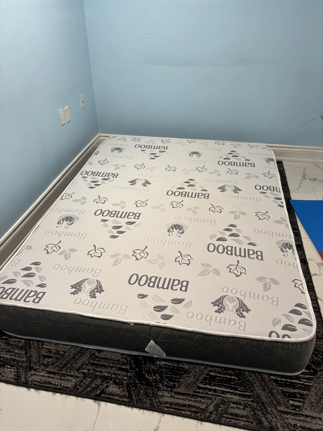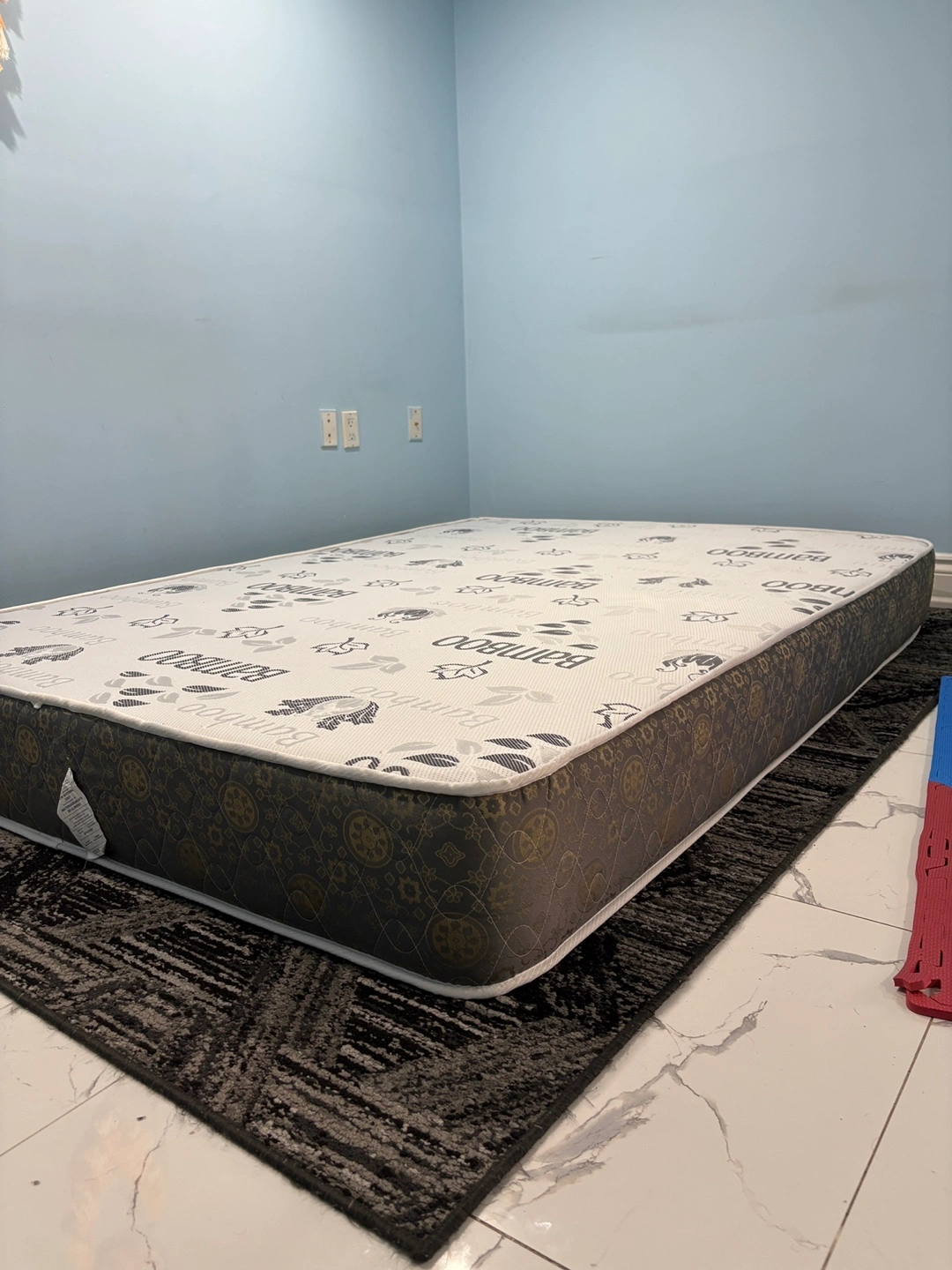 Mattress has a light coloured top with a grey pattern. The side is a dark colour. You can unwind after a long day of work on this mattress. Barely used as you can see in the picture.