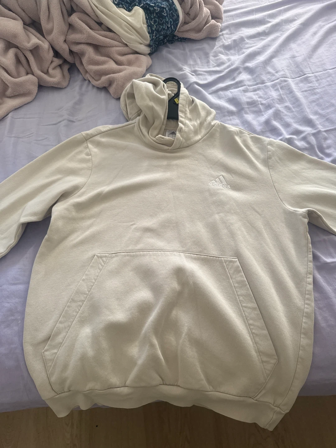 This is an Adidas cream-coloured hoodie. It's made with a soft fabric and features a kangaroo pocket. It's great for casual wear.