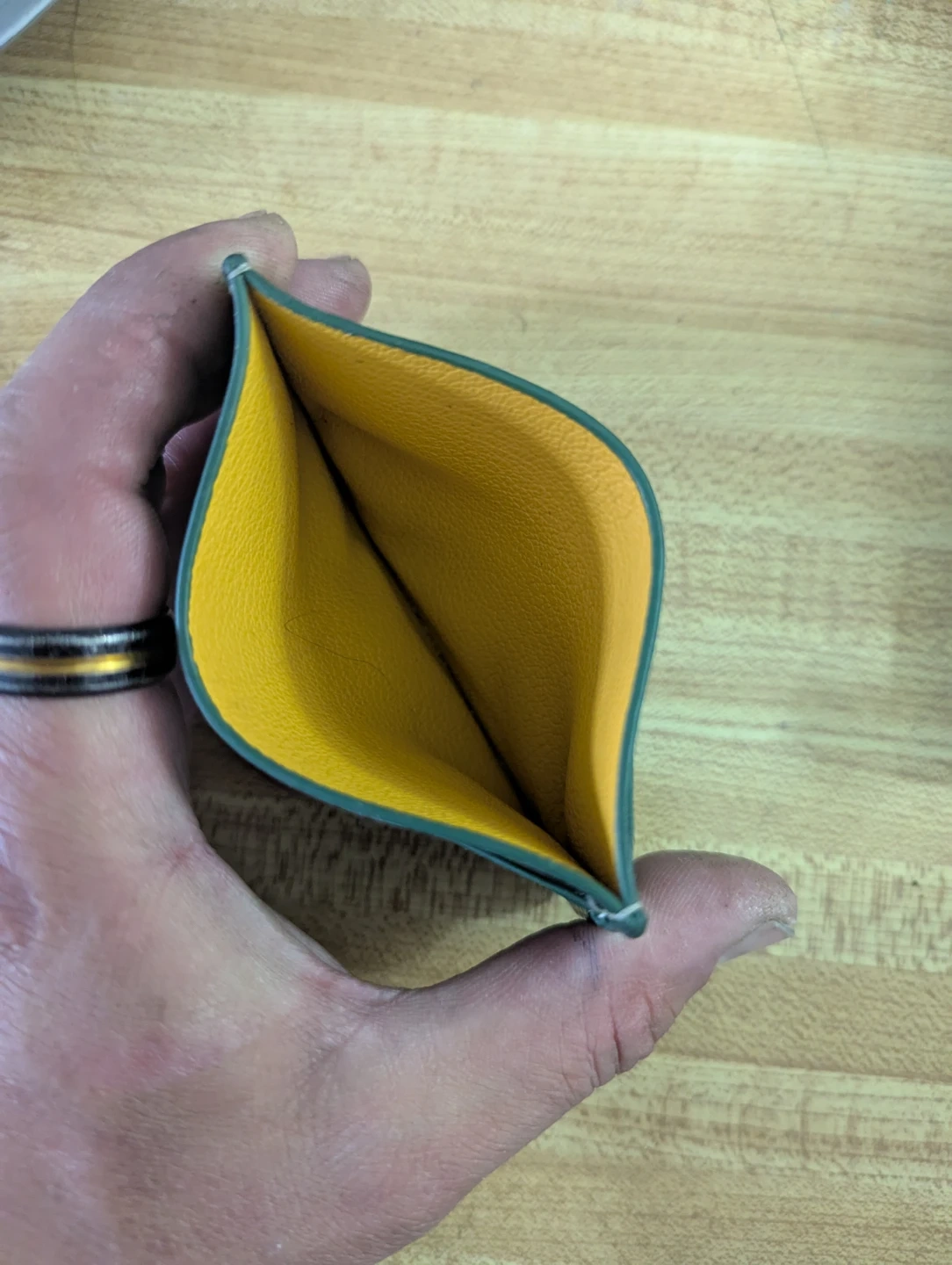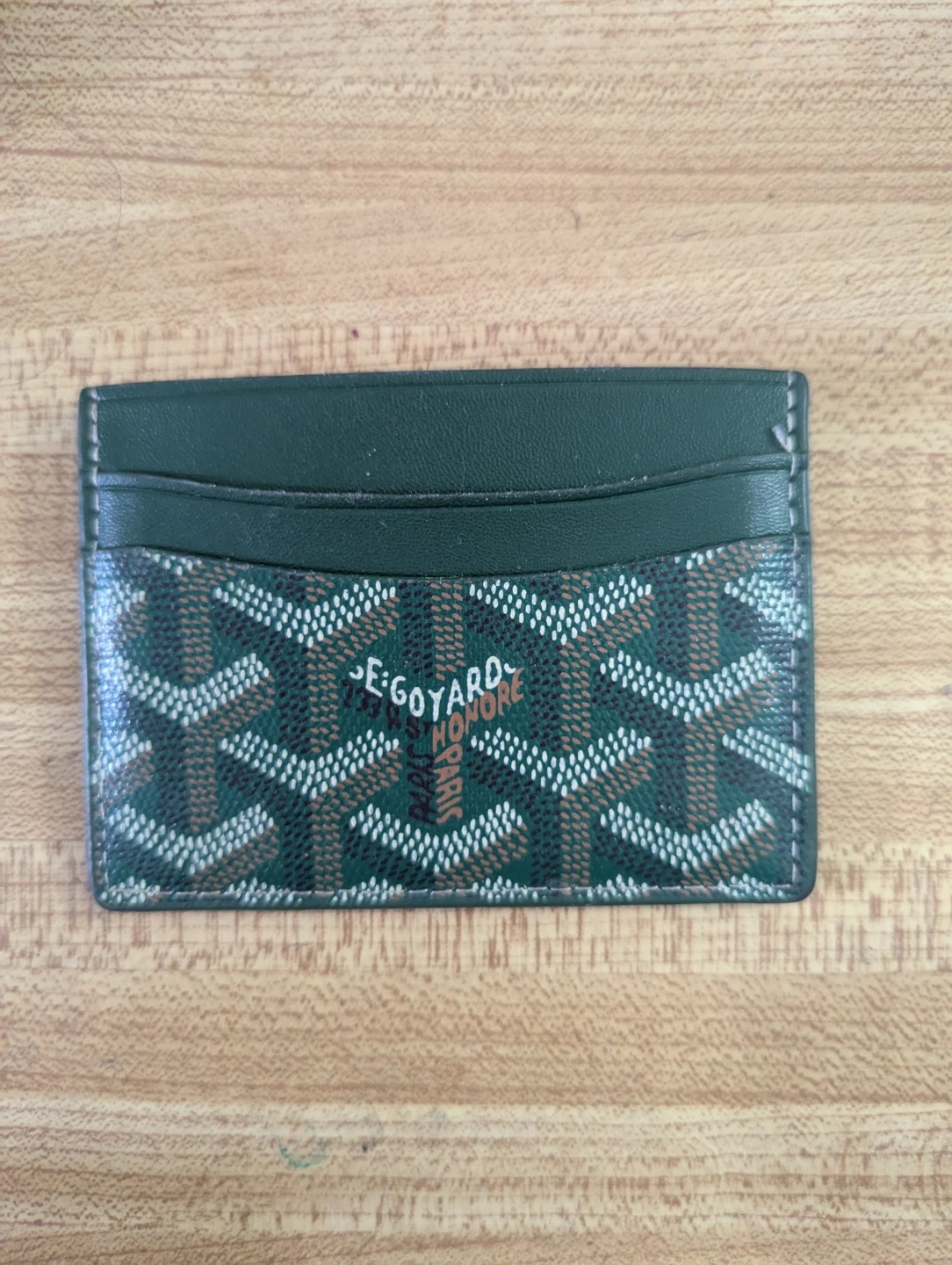 Goyard card holder in green with signature print. Made in France. Leather exterior with yellow interior. It's a stylish way to carry your essential cards.