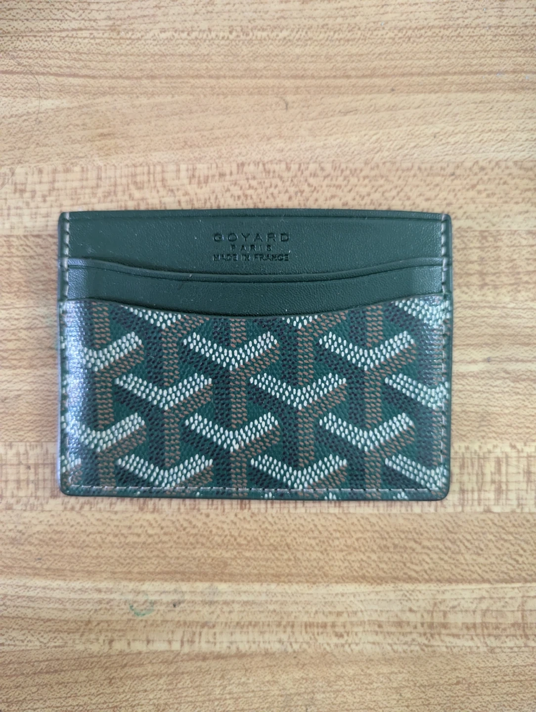 Goyard card holder in green with signature print. Made in France. Leather exterior with yellow interior. It's a stylish way to carry your essential cards.