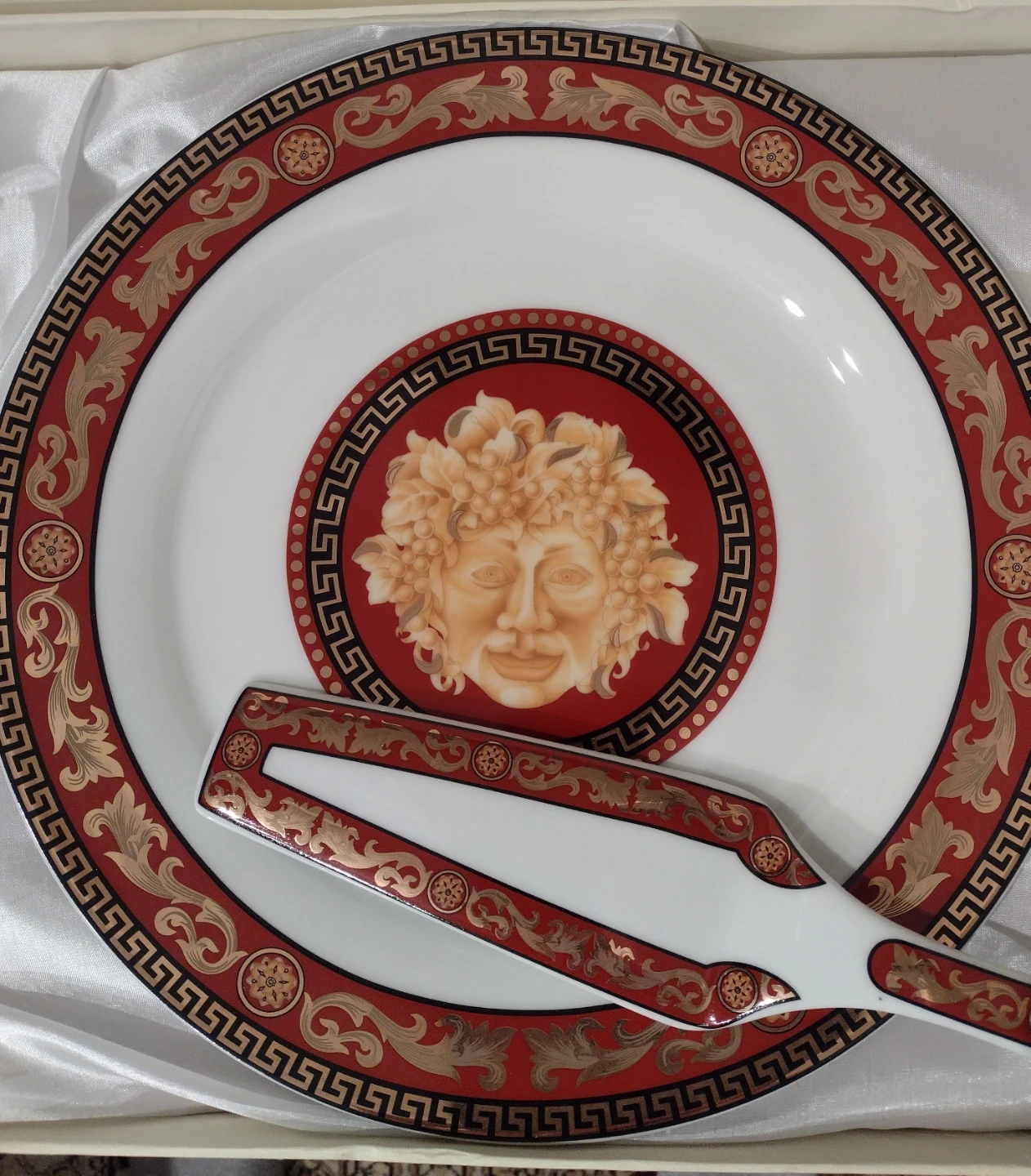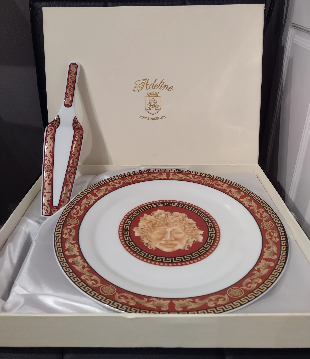 Beautiful Adeline Fine Porcelain cake serving set. Includes a decorative cake plate and a matching server. Features a striking Medusa-inspired face design with ornate red and gold detailing.
