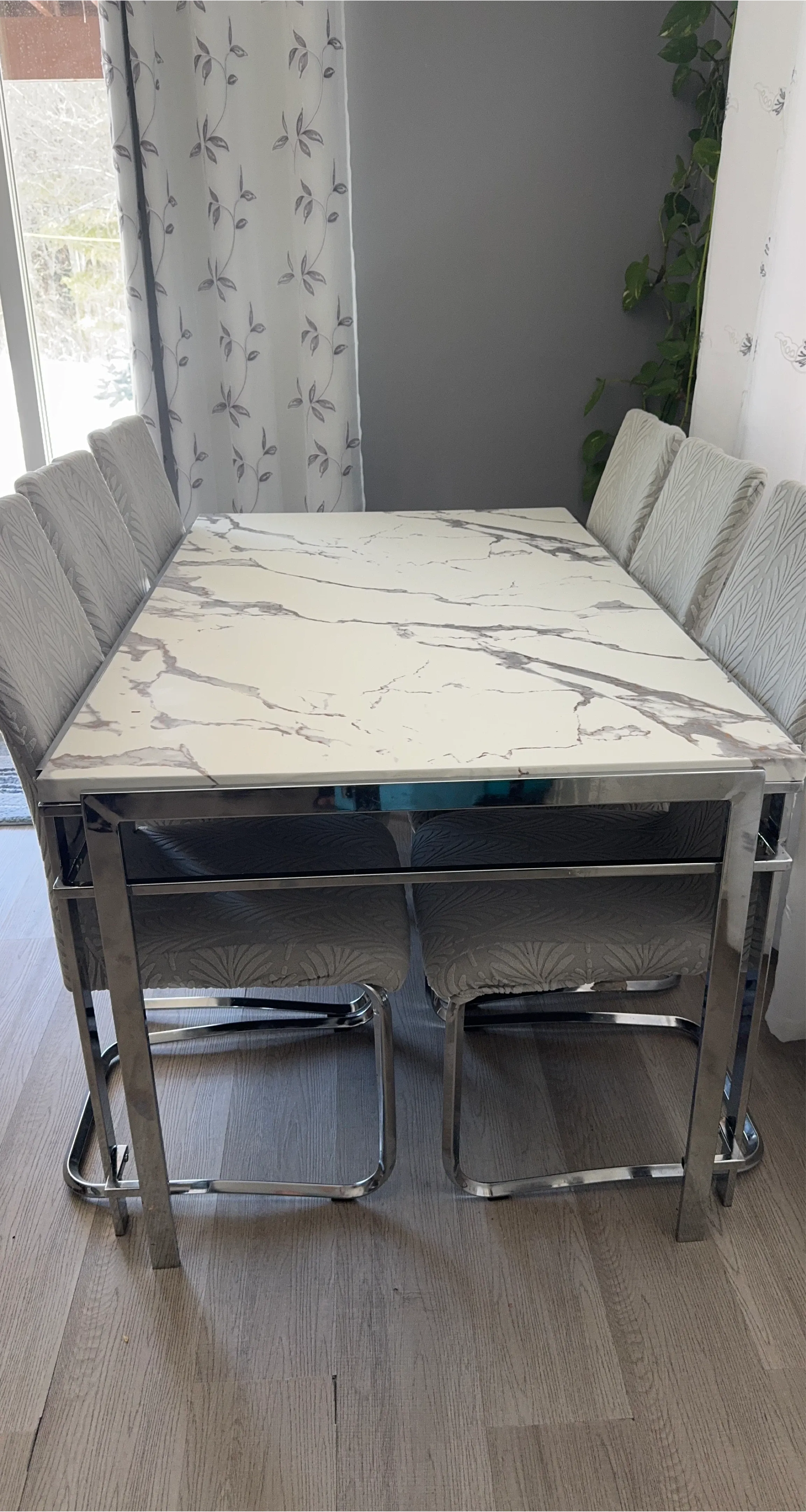 This rectangular dining table features a stunning faux marble top with elegant grey veining. Its base is constructed from durable, shiny chrome, complementing the modern design. It seats six people comfortably. This table is perfect for family dinners or entertaining guests!