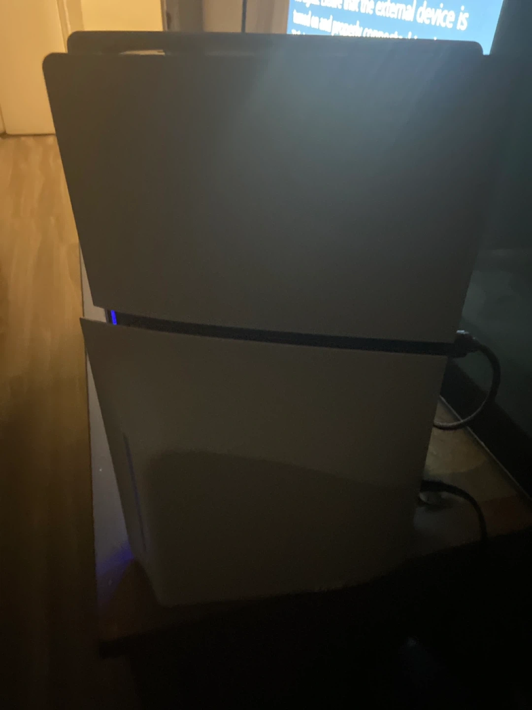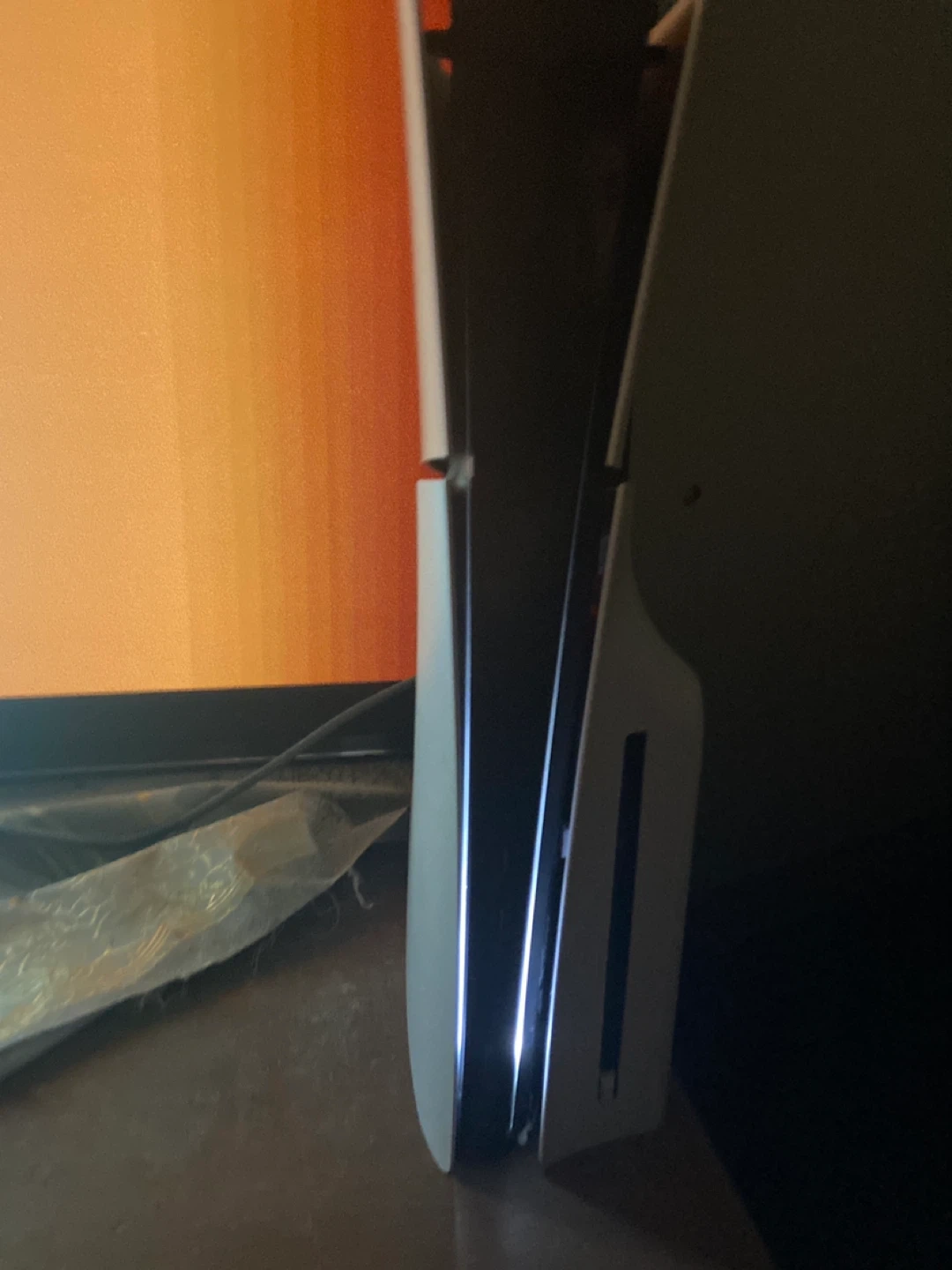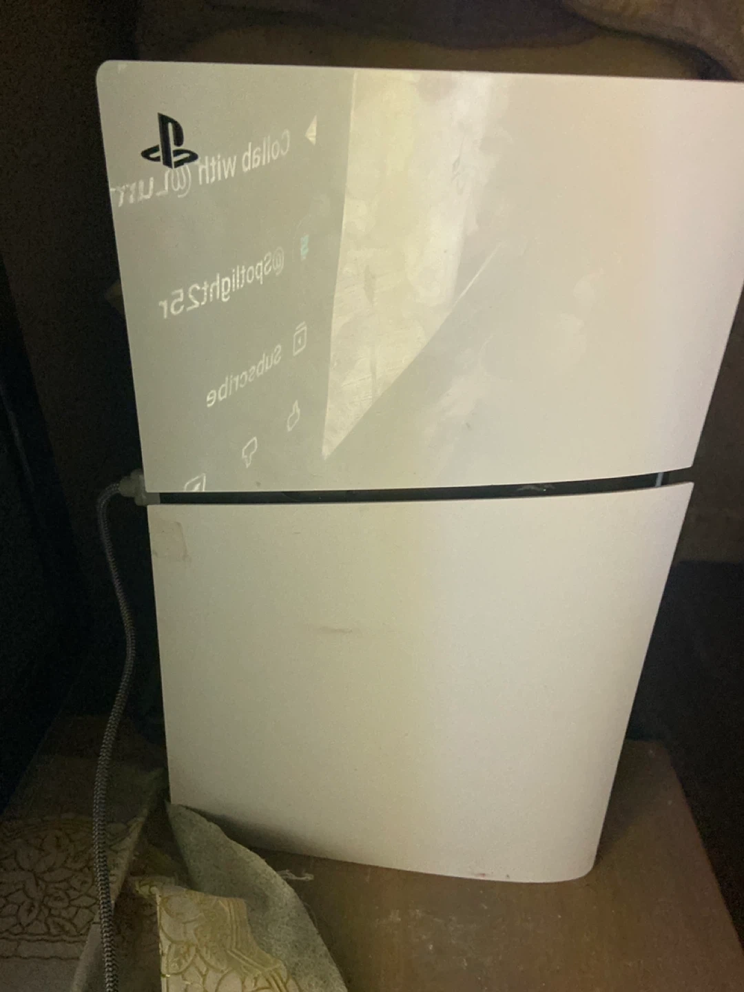 This is a Sony PlayStation 5 console. It's a white model with distinctive curved white panels. It connects via cables to a power source and display.like new has a lot of games no controller