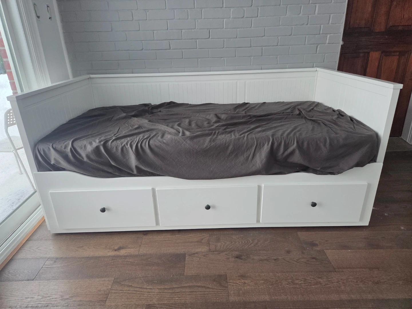 Selling an IKEA Hemnes daybed frame in white. It's in great condition and would be perfect for a guest room or a kid's room. It also has three drawers for extra storage!