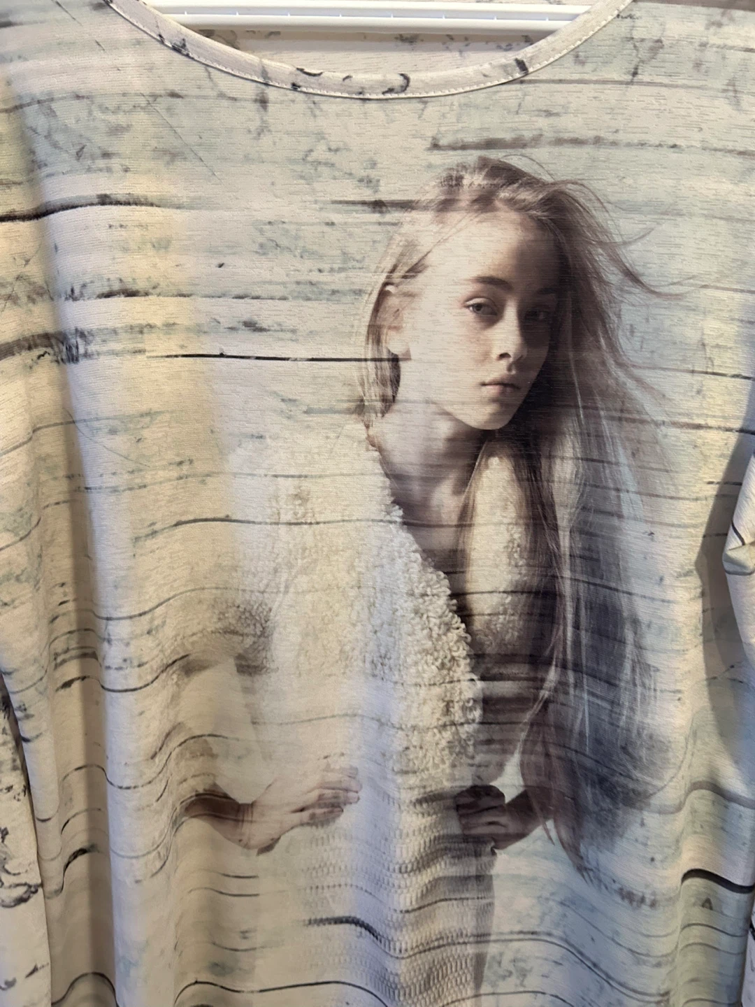 A long sleeve t-shirt with a unique graphic print of a young woman. It features a mix of abstract patterns and a realistic portrait. Lightweight and comfortable material. Crew neck style.