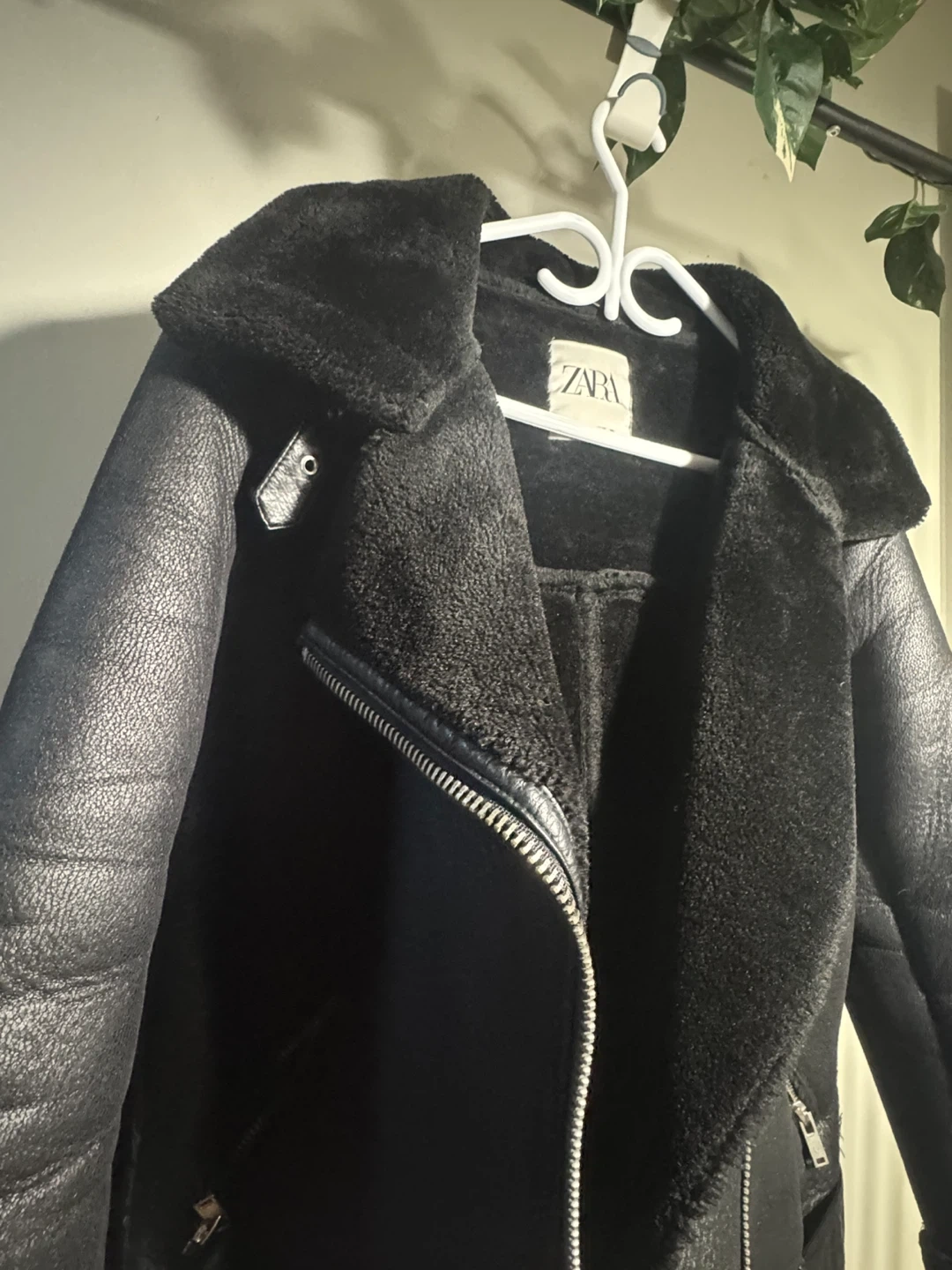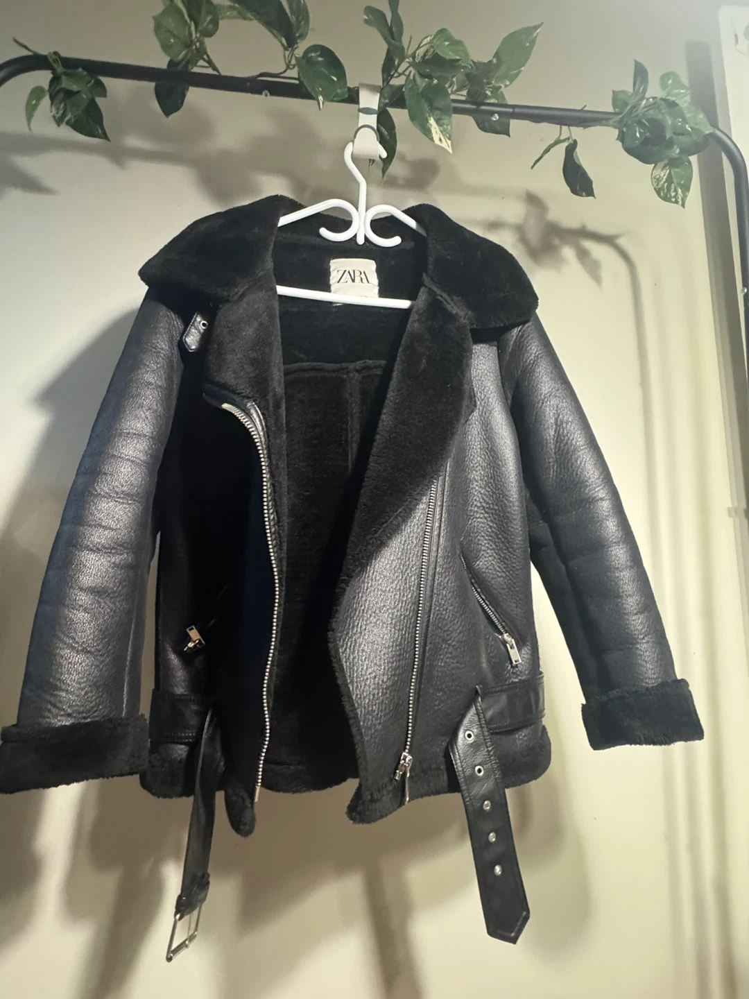 This Zara aviator jacket features a faux leather exterior with a cozy shearling lining and collar. It's designed with a full zip closure and buckle details. A warm option for cooler weather!