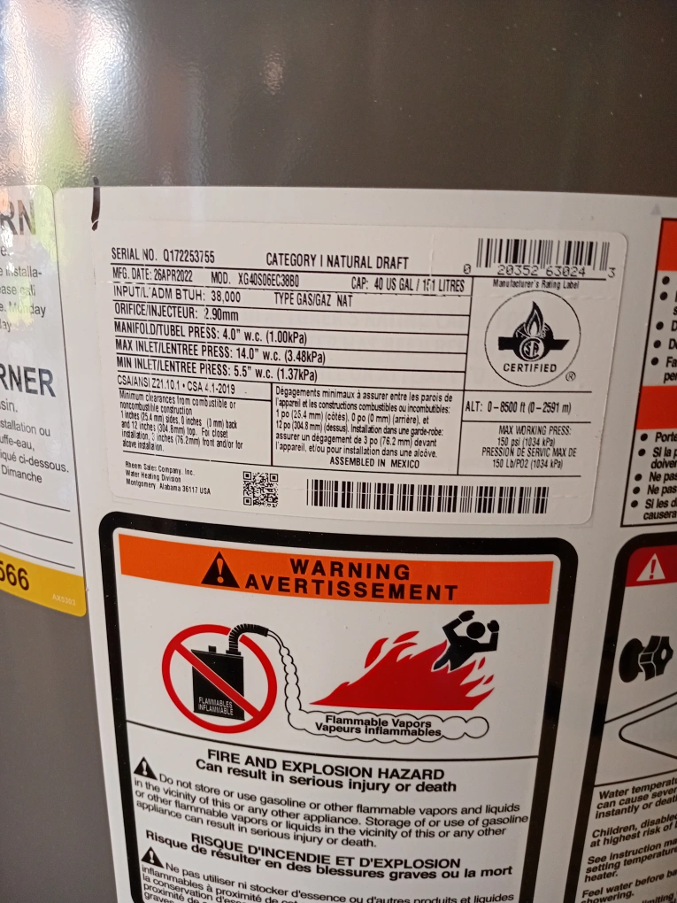 Selling a Rheem Performance water heater. It's a 40 US gal / 151 litres natural draft model. The input/l ADM BTUH is 38.000. It was manufactured April 2022. Used for 1year. Bought for 1,100 dollars, selling for 90 dollars.