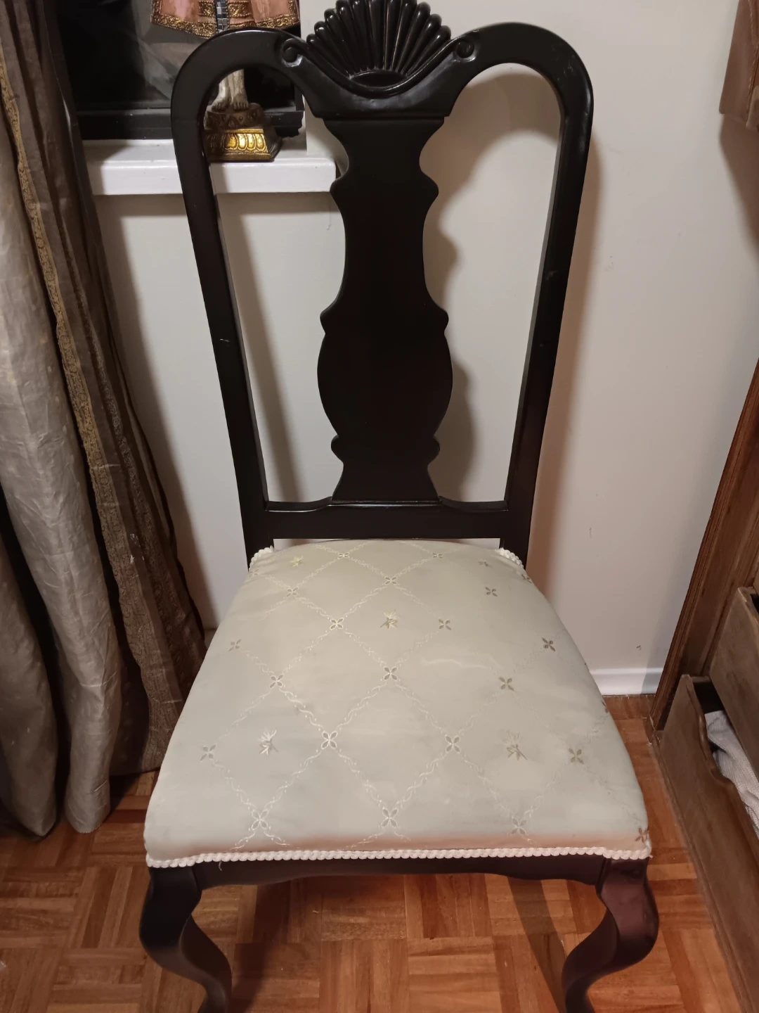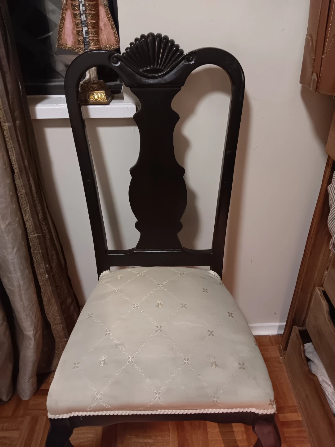 Dark wood dining chair with a patterned upholstered seat. It has a high back with a decorative shell carving at the top. This chair would make a lovely addition to a dining room or accent piece for any room. Light stains on fabric.