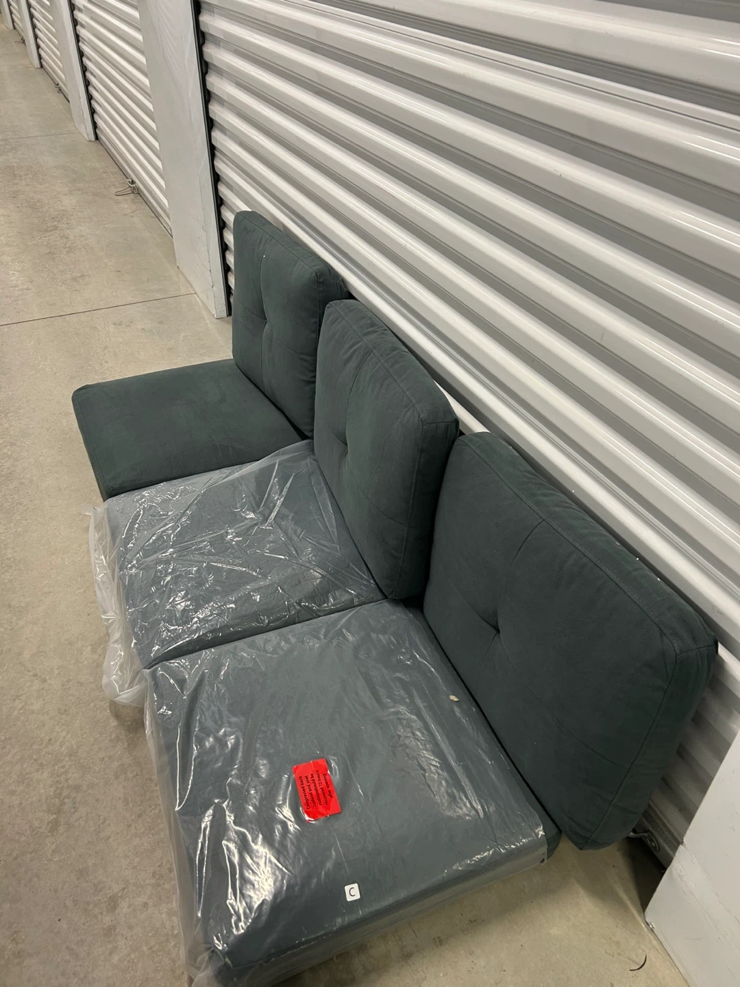 This is a dark grey modular. It's made of fabric and has tufted back cushions. It includes Three Seat cushions and three back cushions.