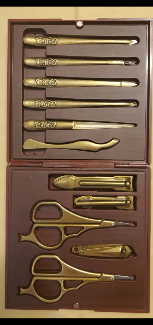 Beautiful vintage manicure set. Gold-tone tools. Wooden storage case. Includes scissors, nail clippers, tweezers, and more. Perfect for a gift or personal use.