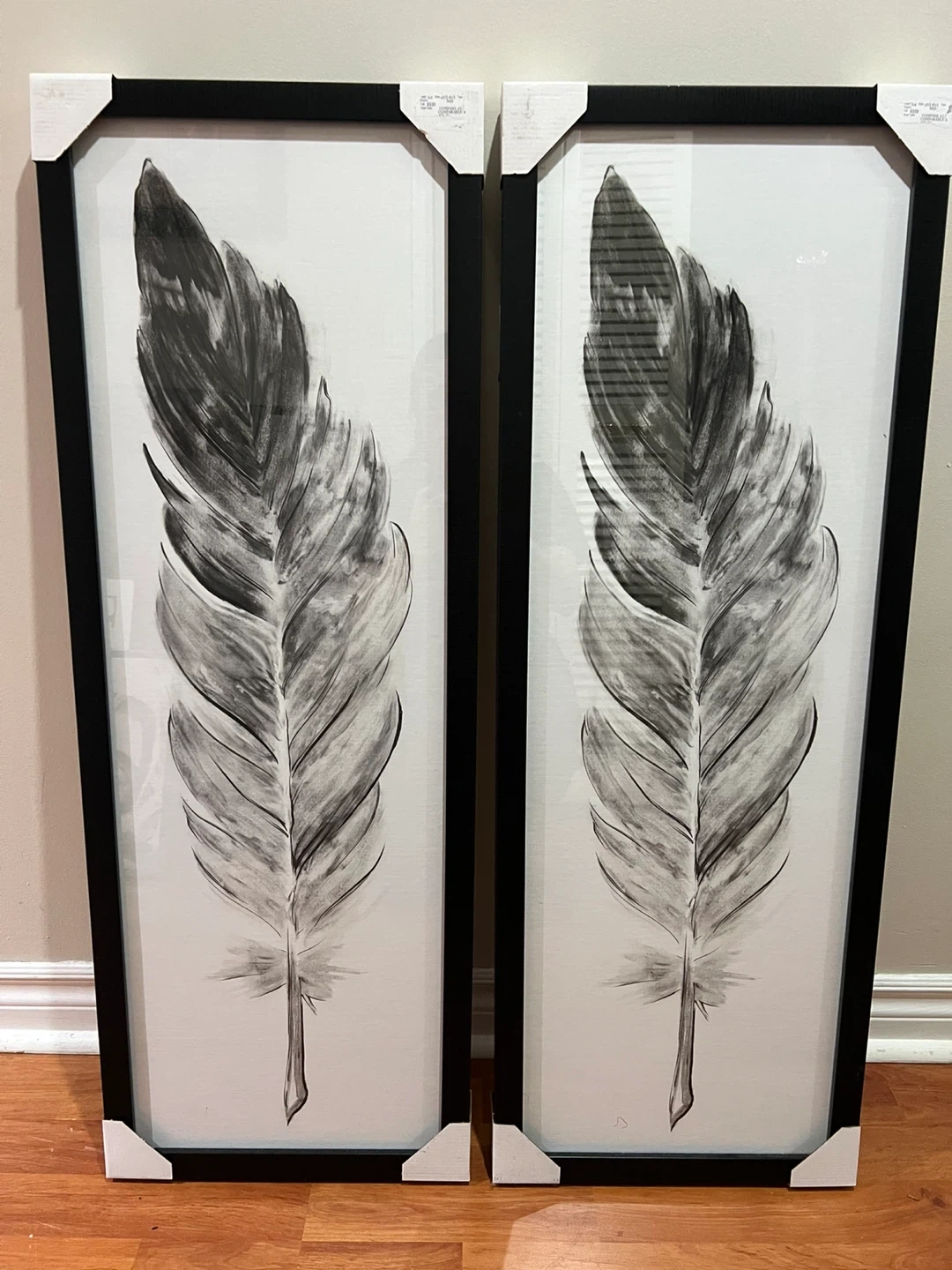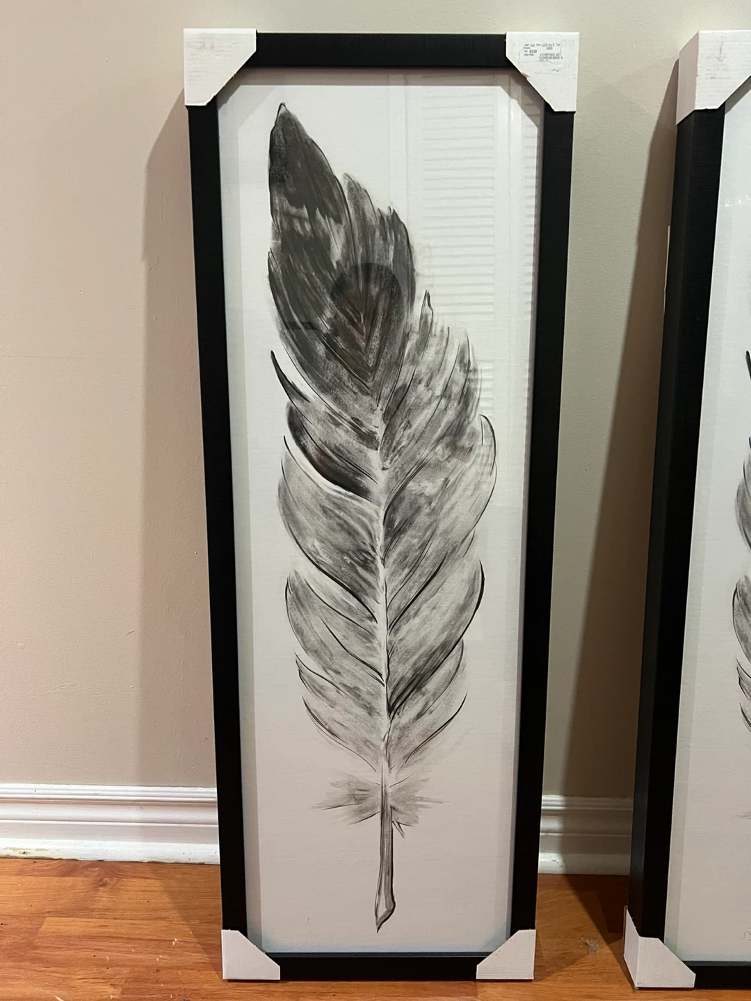 Set of two framed wall art pieces, each featuring a black and white feather design. These vertical pieces have black frames and would add a touch of elegance to any room. Measures approximately 10" x 30".