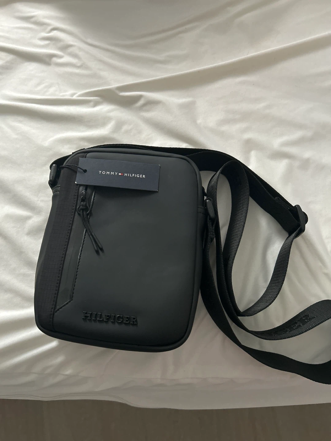 This Tommy Hilfiger crossbody bag is black. It's a handy size for everyday essentials. The adjustable strap makes it comfortable to wear. New not used