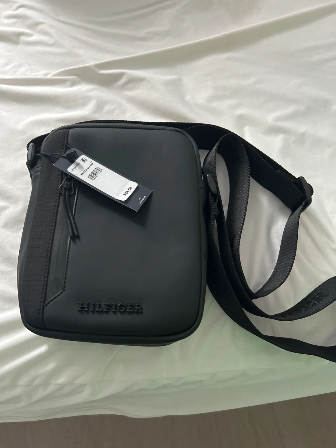 This Tommy Hilfiger crossbody bag is black. It's a handy size for everyday essentials. The adjustable strap makes it comfortable to wear. New not used