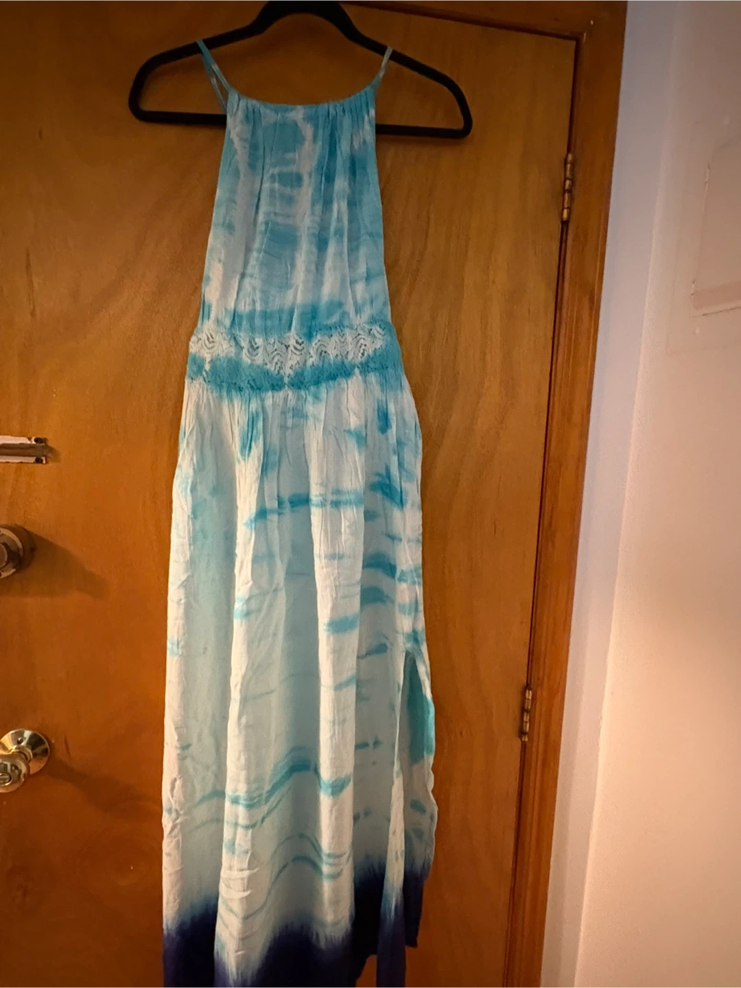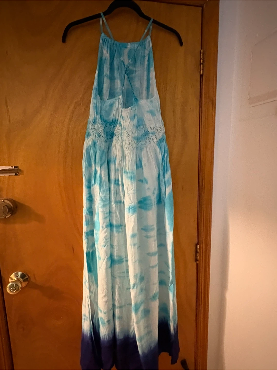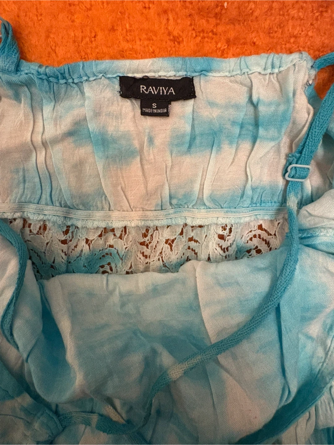 This is a Raviya maxi dress with a tie-dye pattern. It's a size small and made in India. The dress features adjustable straps and lace detailing on the bodice.