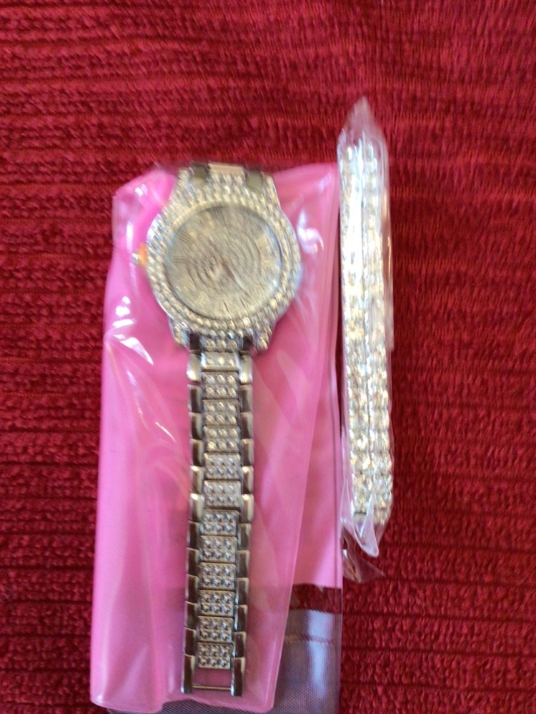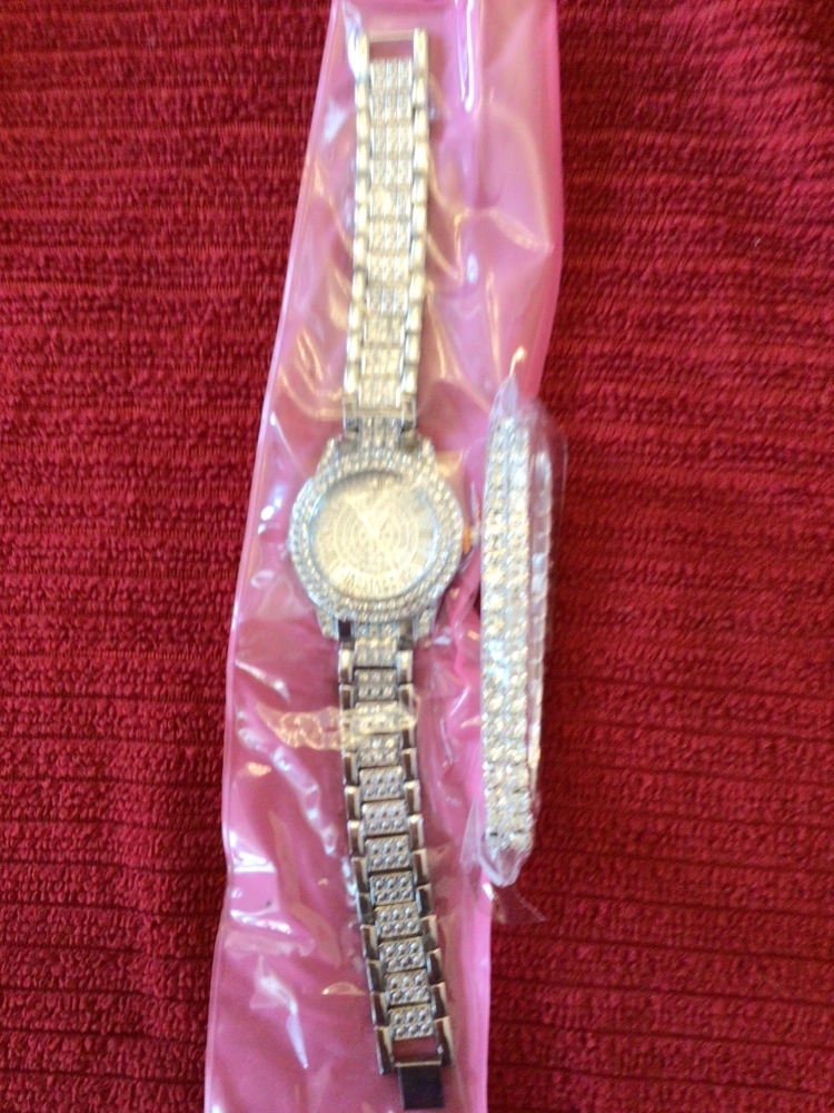 A set includes a watch and a matching bracelet. Also, a matching necklace, ring and studs. Could be purchased separately - watch $15.00 Necklace, ring and studs $15.00 The whole set $25.00. The metal is hypoallergenic, safe to take shower with.