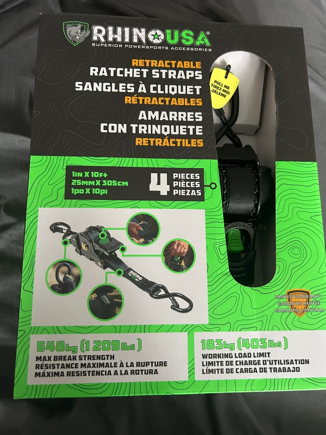 60Selling a brand new set of Rhino USA Retractable Ratchet Straps, still in the box! These are superior powersports accessories, perfect for securing your gear. Includes 4 retractable ratchet straps and 4 soft loops, plus a carry bag for easy storage. They have a max break strength of 548kg (1209 lbs) and a working load limit of 183kg (403 lbs)