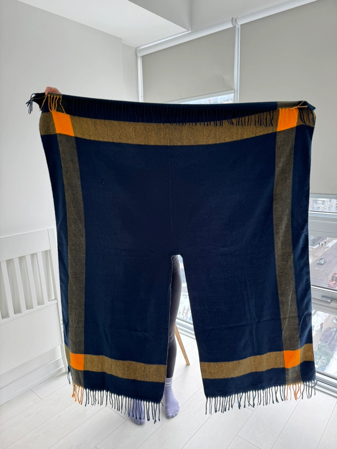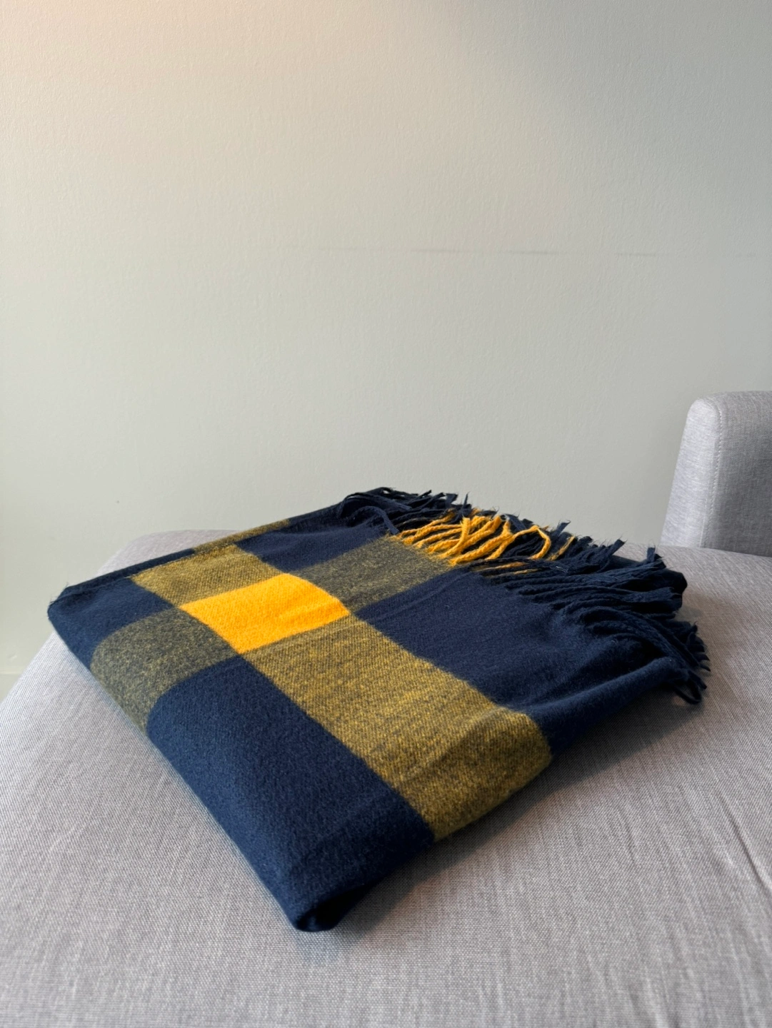 Soft and cozy shaul/ scarf. Navy blue base with yellow plaid pattern. Fringed edges. Perfect for chilly evenings. Never worn.