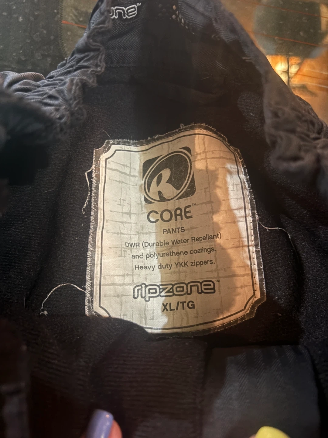 Selling a pair of Ripzone Core pants in size XL/TG. They're black and feature a DWR (Durable Water Repellant) finish with polyurethane coatings and heavy-duty YKK zippers