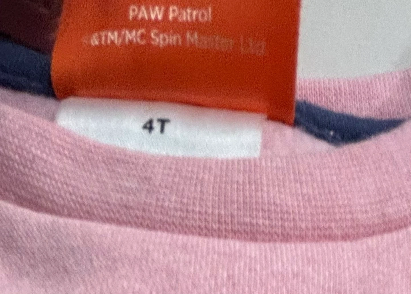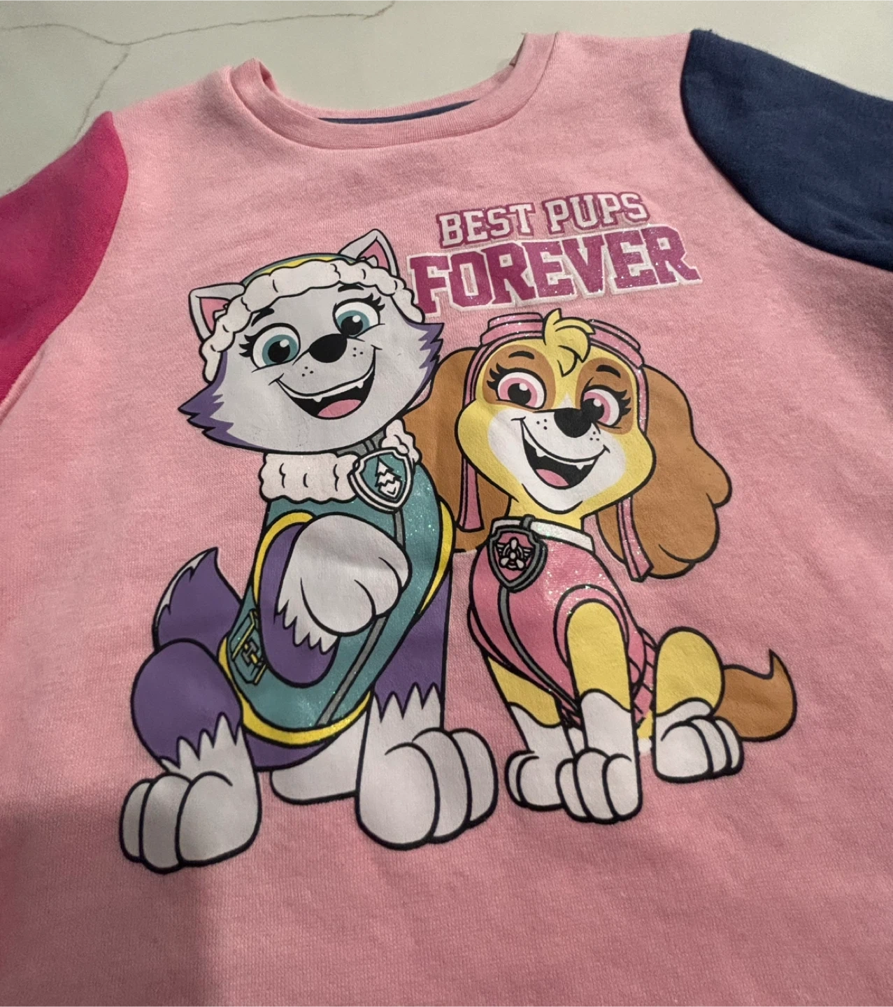 This pink crewneck sweatshirt features a "Best Pups Forever" graphic with characters from Paw Patrol. It has long sleeves, with one pink and one navy blue sleeve. It's a size 4T.