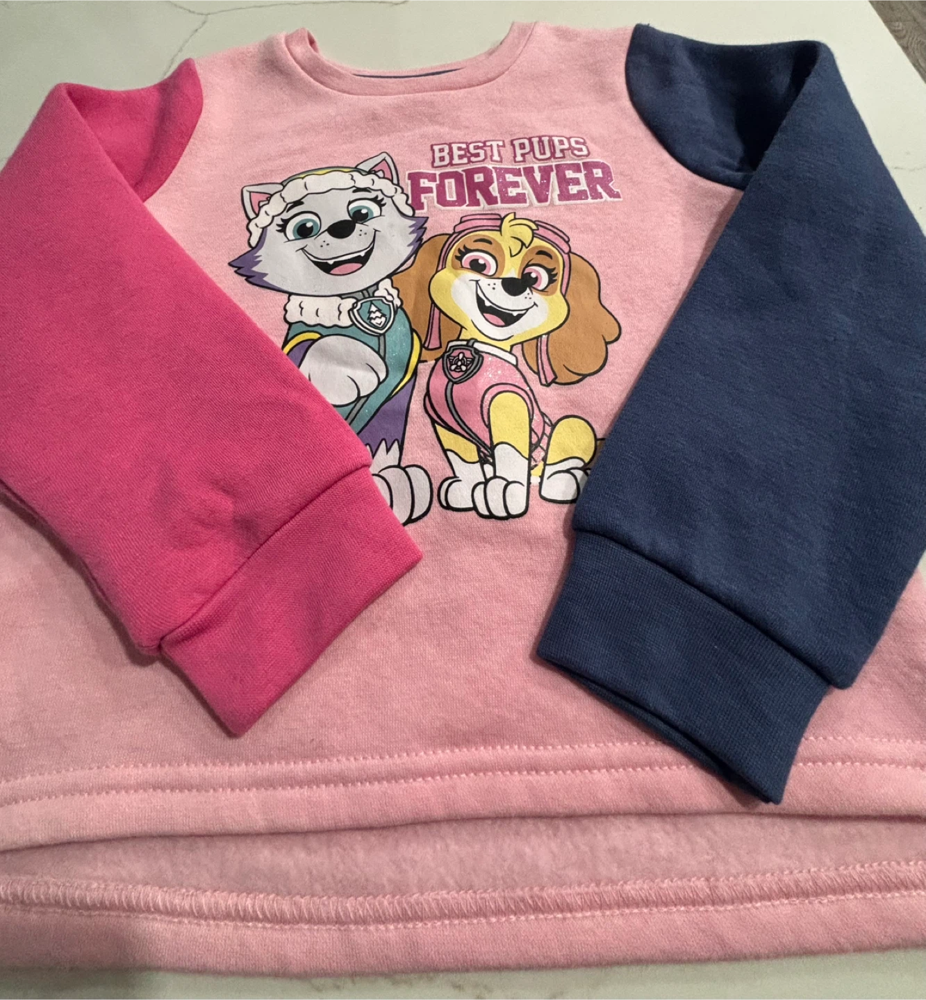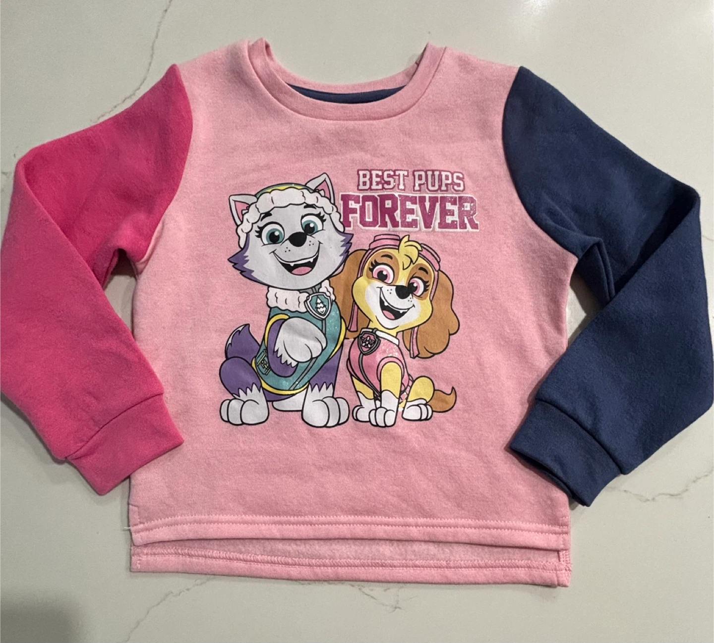 This pink crewneck sweatshirt features a "Best Pups Forever" graphic with characters from Paw Patrol. It has long sleeves, with one pink and one navy blue sleeve. It's a size 4T.