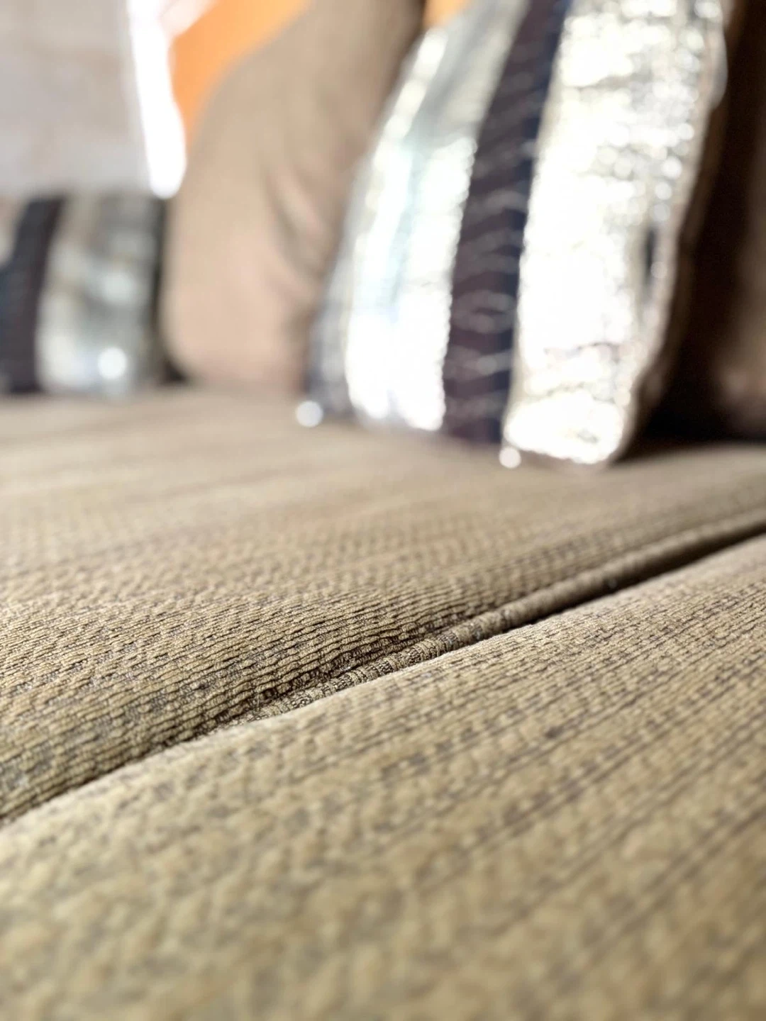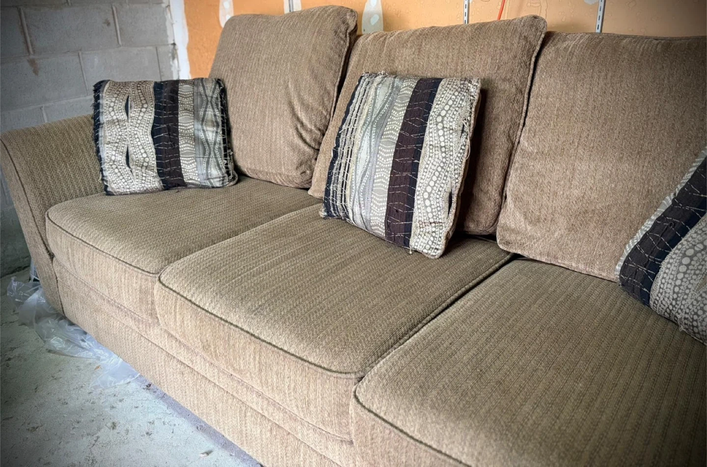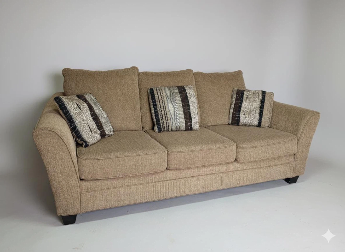 Three-seater sofa in a textured tan fabric. Comes with three decorative throw pillows. Comfortable seating for any living space.