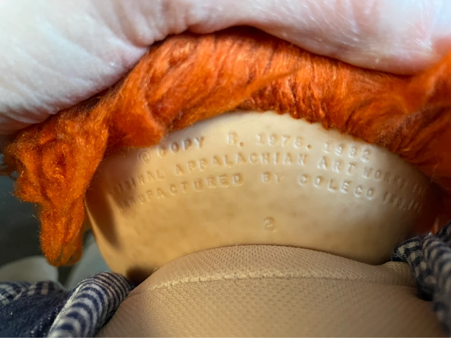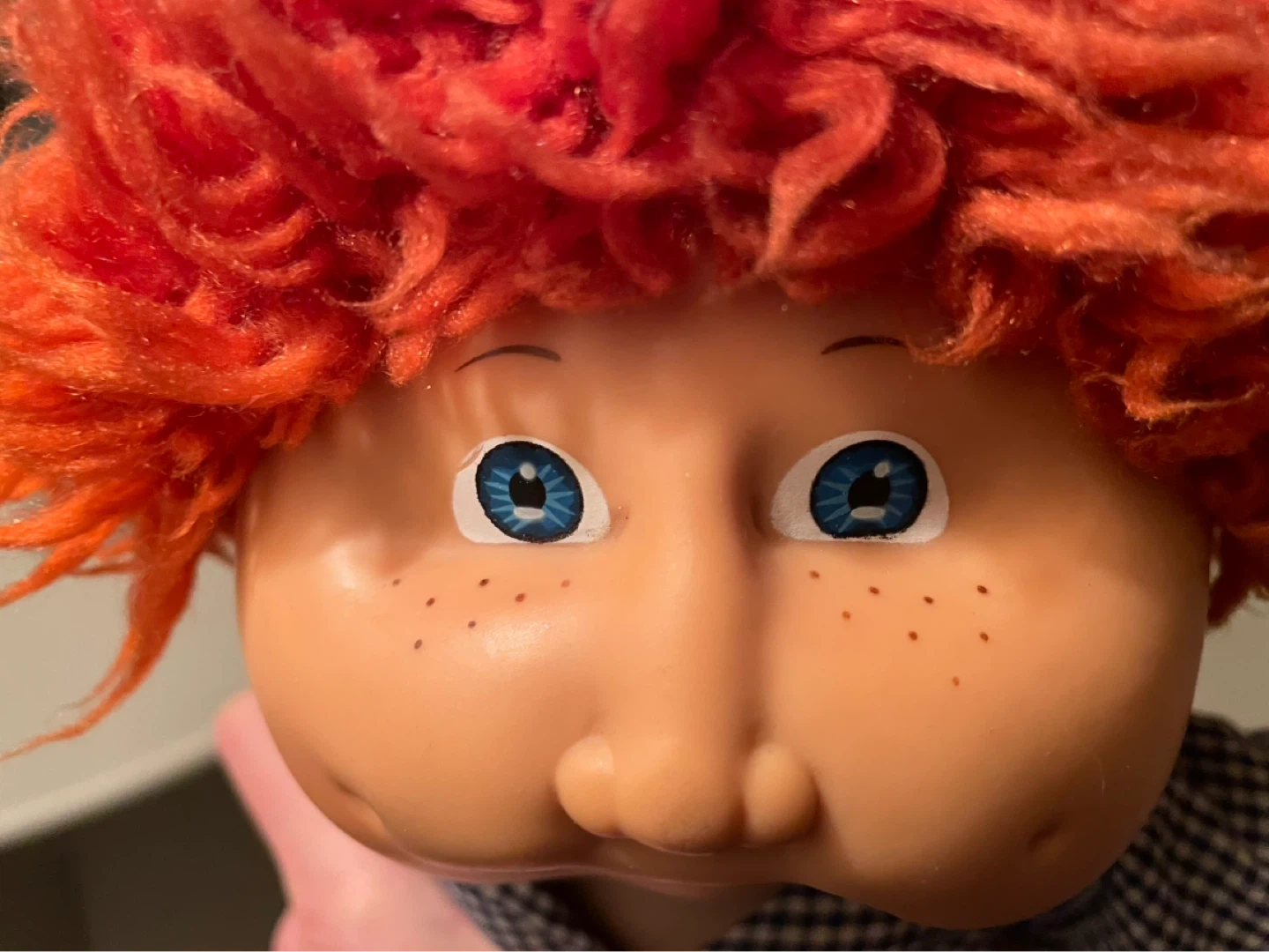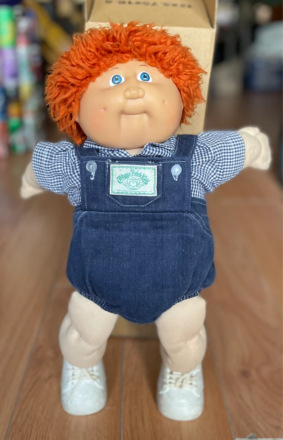 This is a vintage Cabbage Patch Kid doll with red hair and blue eyes from 1985. It was manufactured by Coleco. The doll comes dressed in his original overalls, checkered shirt, and white sneakers. His given name is Hubert. He was played with a lot back then and his body could use a wash.