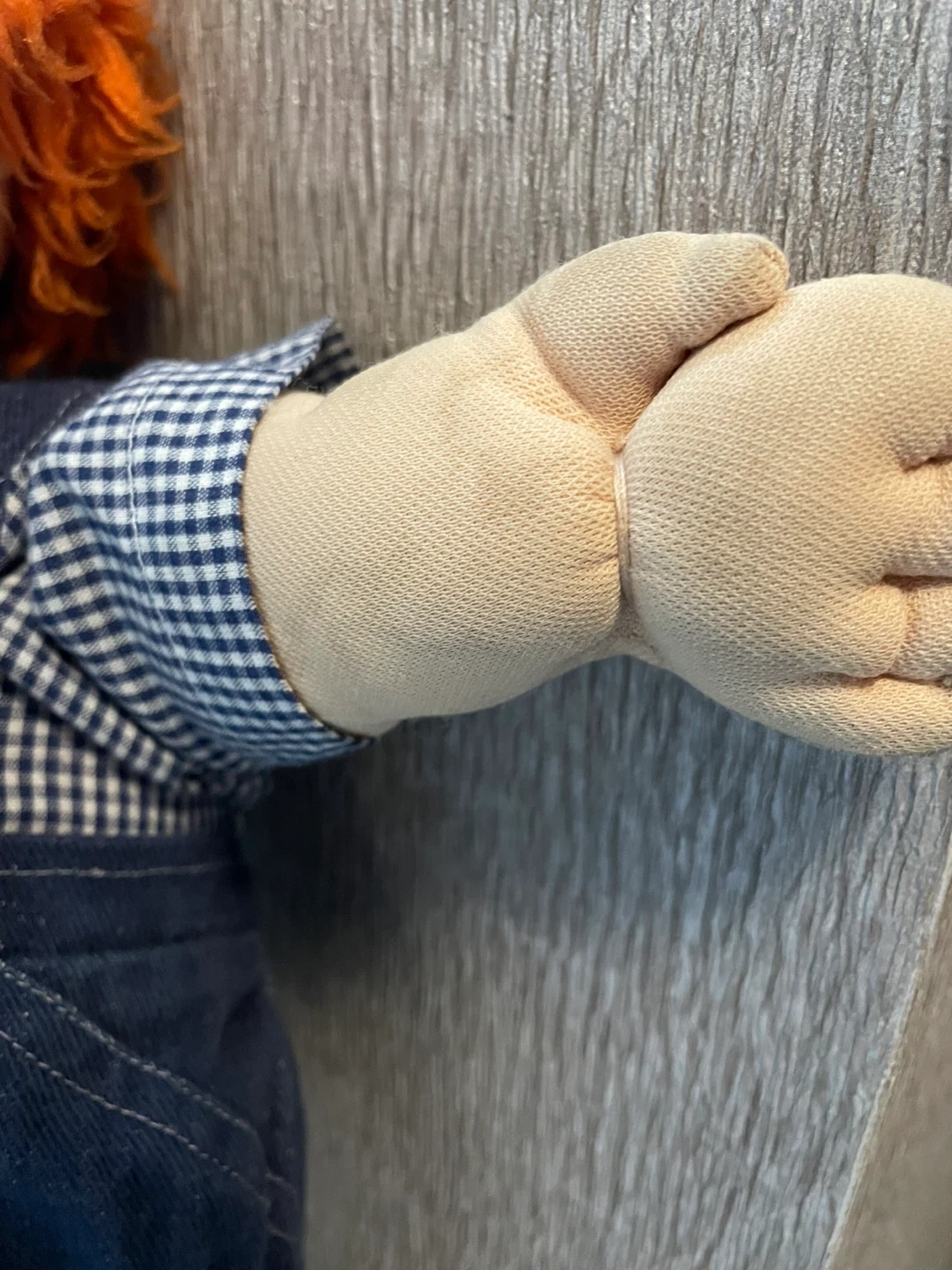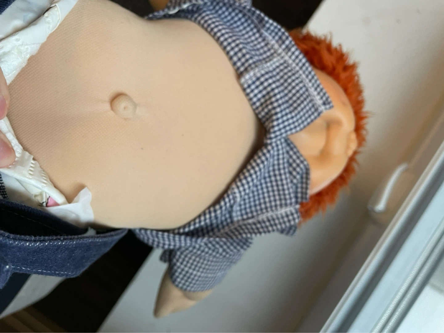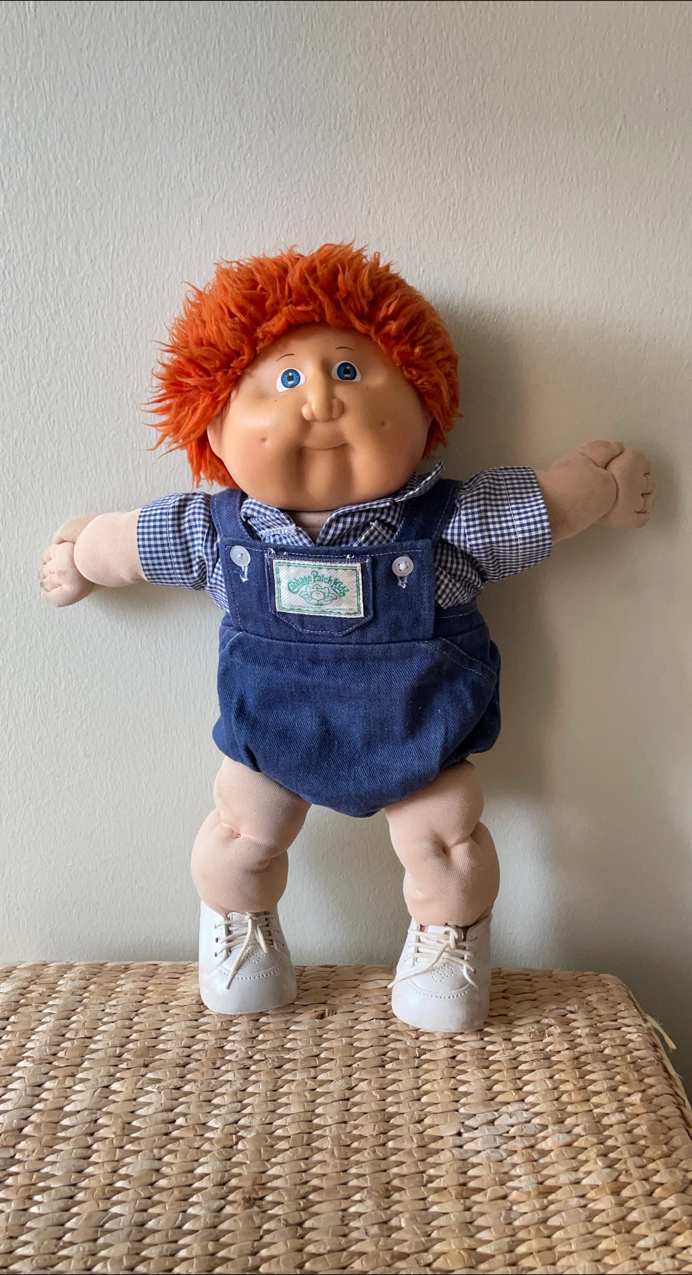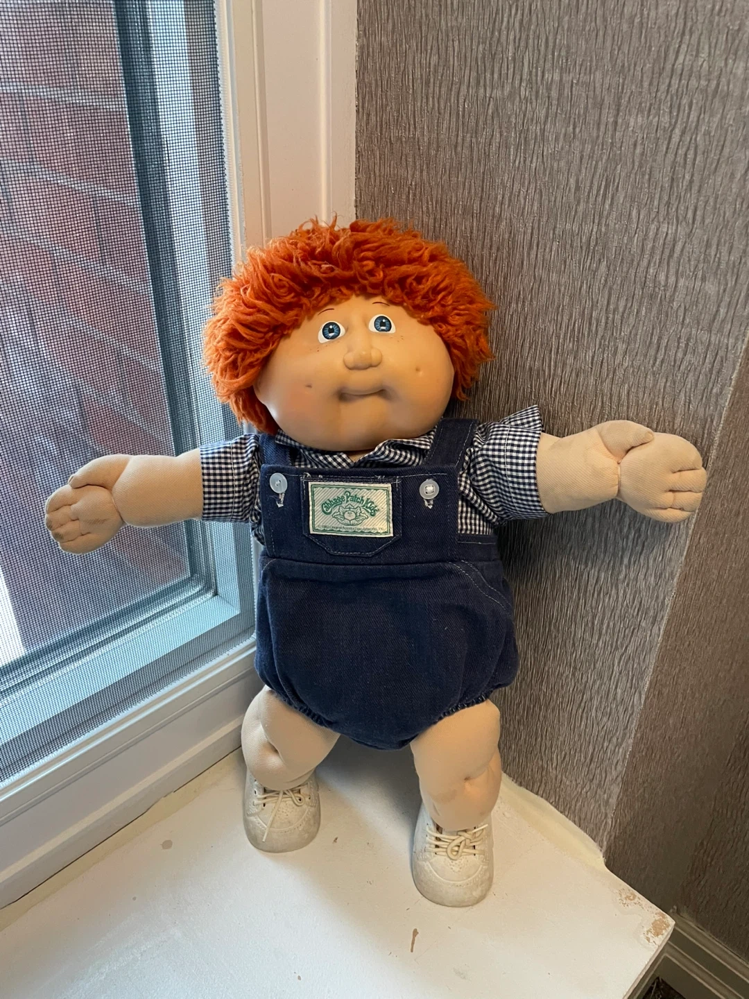 This is a vintage Cabbage Patch Kid doll with red hair and blue eyes from 1985. It was manufactured by Coleco. The doll comes dressed in his original overalls, checkered shirt, and white sneakers. His given name is Hubert. He was played with a lot back then and his body could use a wash.