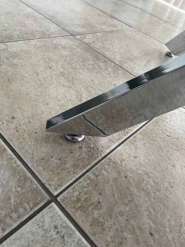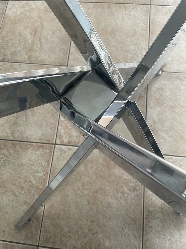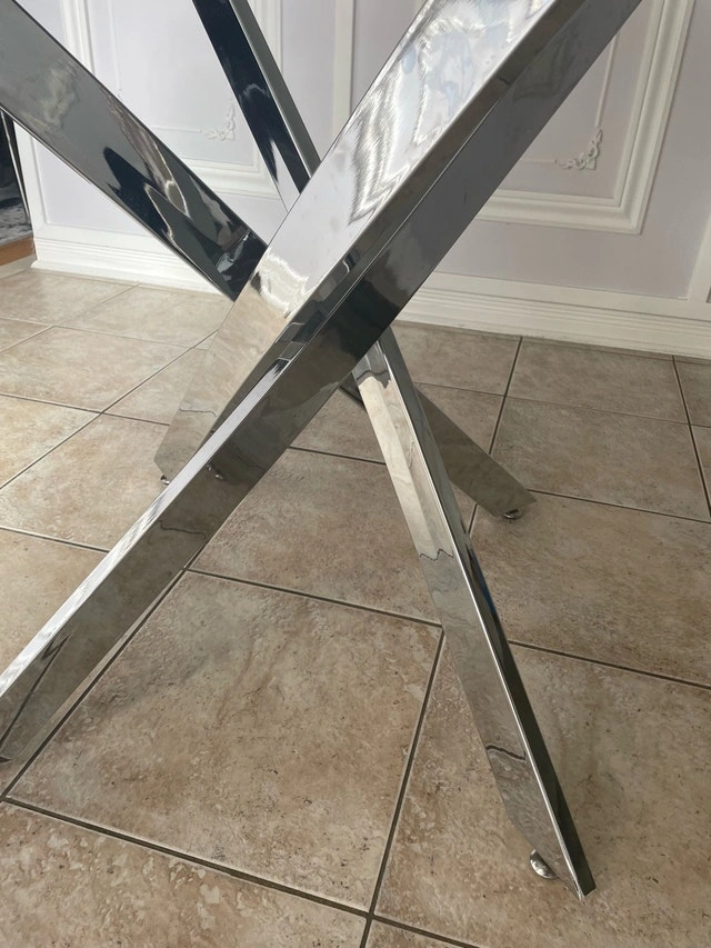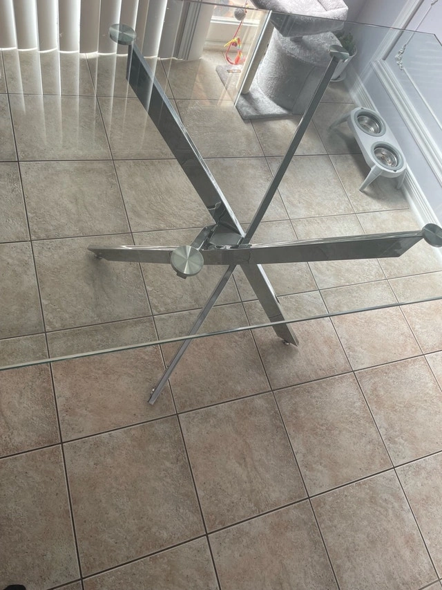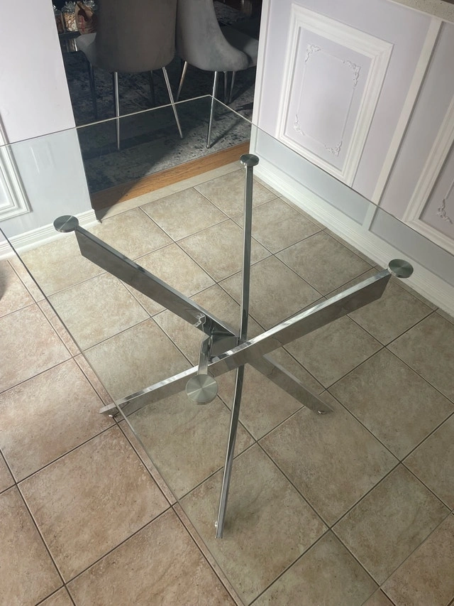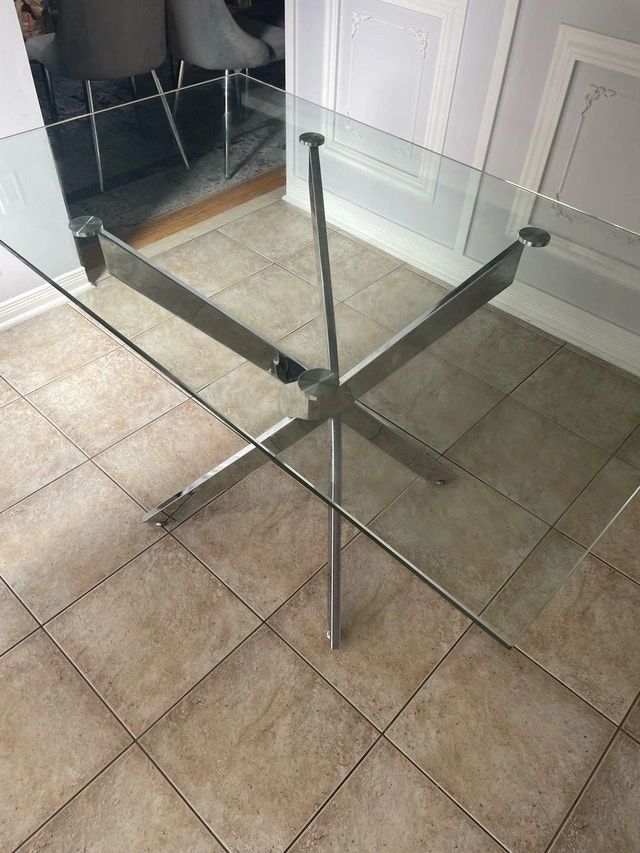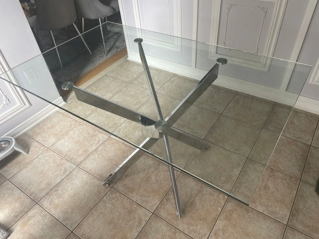 Modern glass-top dining table featuring a sleek, minimalist design. The table has a clear tempered glass surface supported by a sturdy brushed metal base with a unique geometric structure, giving it a stylish and contemporary look. Dimensions are approximately 150 cm in length, 60 cm in width, and about 100 cm in height. The glass is in good condition with no major damage, and the metal base is solid and stable. Perfect for a dining area, kitchen, or even as a modern workspace. Easy to match with different chair styles.