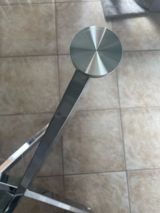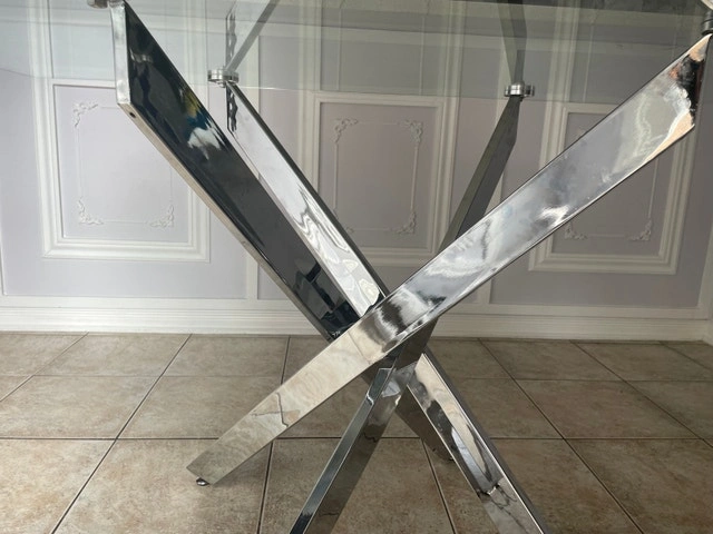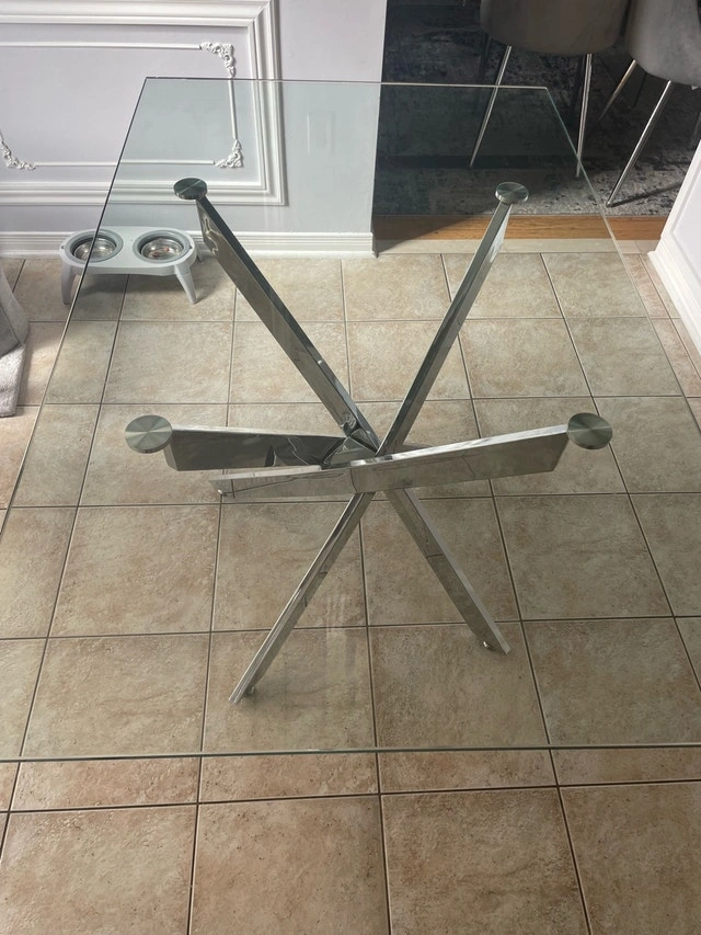 Modern glass-top dining table featuring a sleek, minimalist design. The table has a clear tempered glass surface supported by a sturdy brushed metal base with a unique geometric structure, giving it a stylish and contemporary look. Dimensions are approximately 150 cm in length, 60 cm in width, and about 100 cm in height. The glass is in good condition with no major damage, and the metal base is solid and stable. Perfect for a dining area, kitchen, or even as a modern workspace. Easy to match with different chair styles.