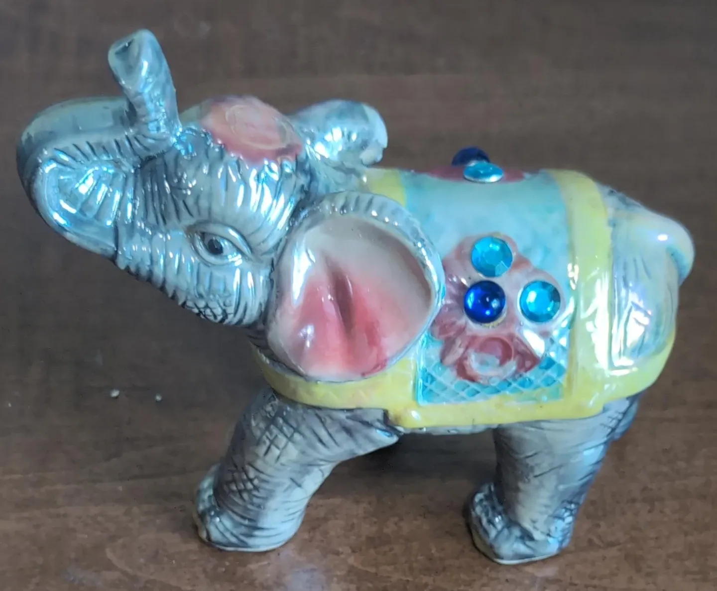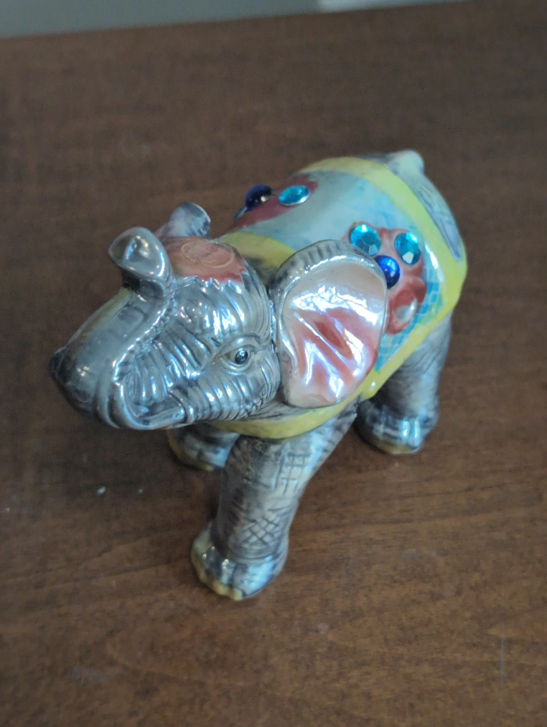 This charming elephant figurine features a decorative saddle adorned with colourful faux jewels. It's made of a shiny, metallic material with a pearlescent finish. Adds a whimsical touch to any shelf or decor!