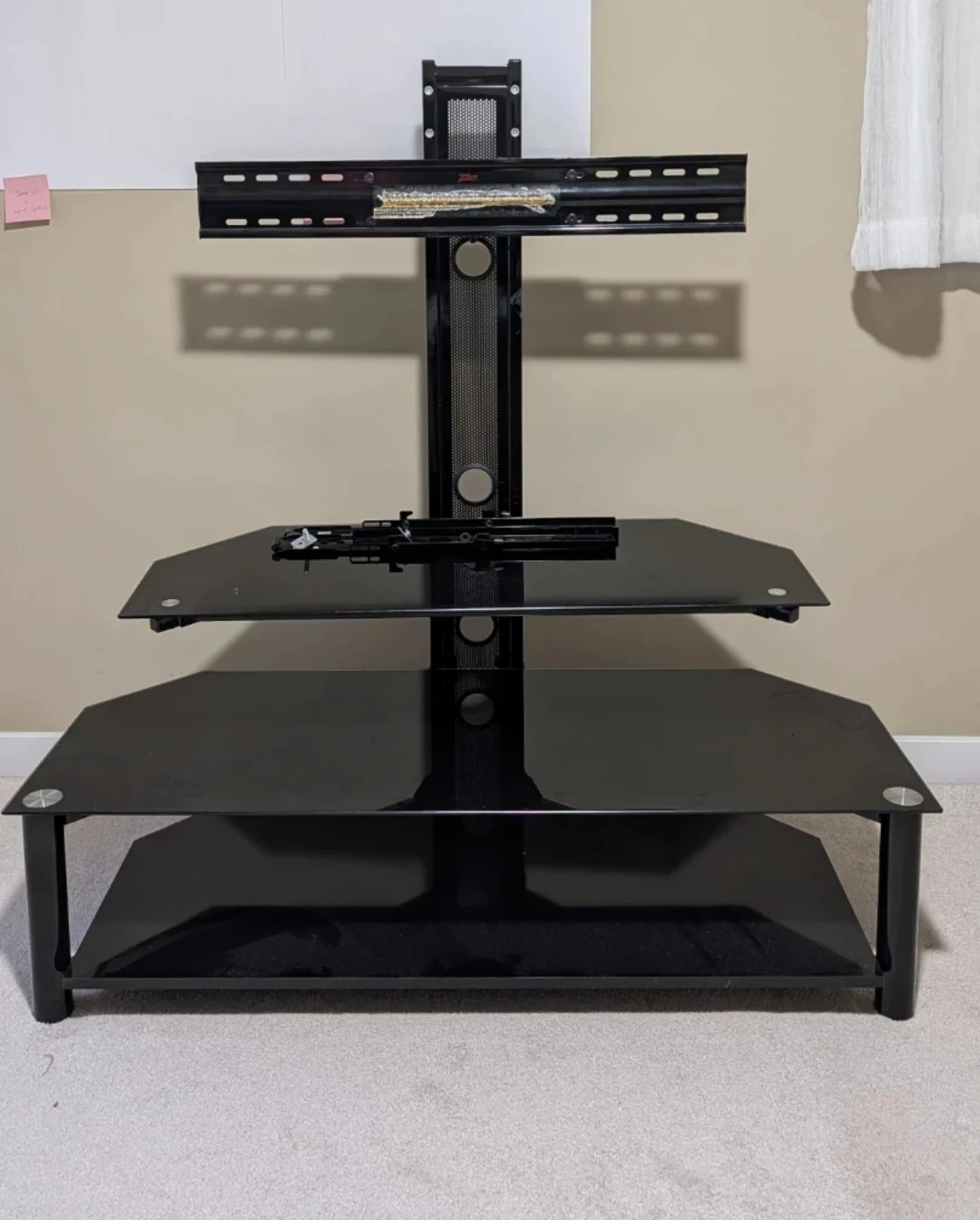 Selling a black glass TV stand. It's in great shape and ready for a new home theatre setup! The stand has multiple tiers for your components and a mount for your TV.