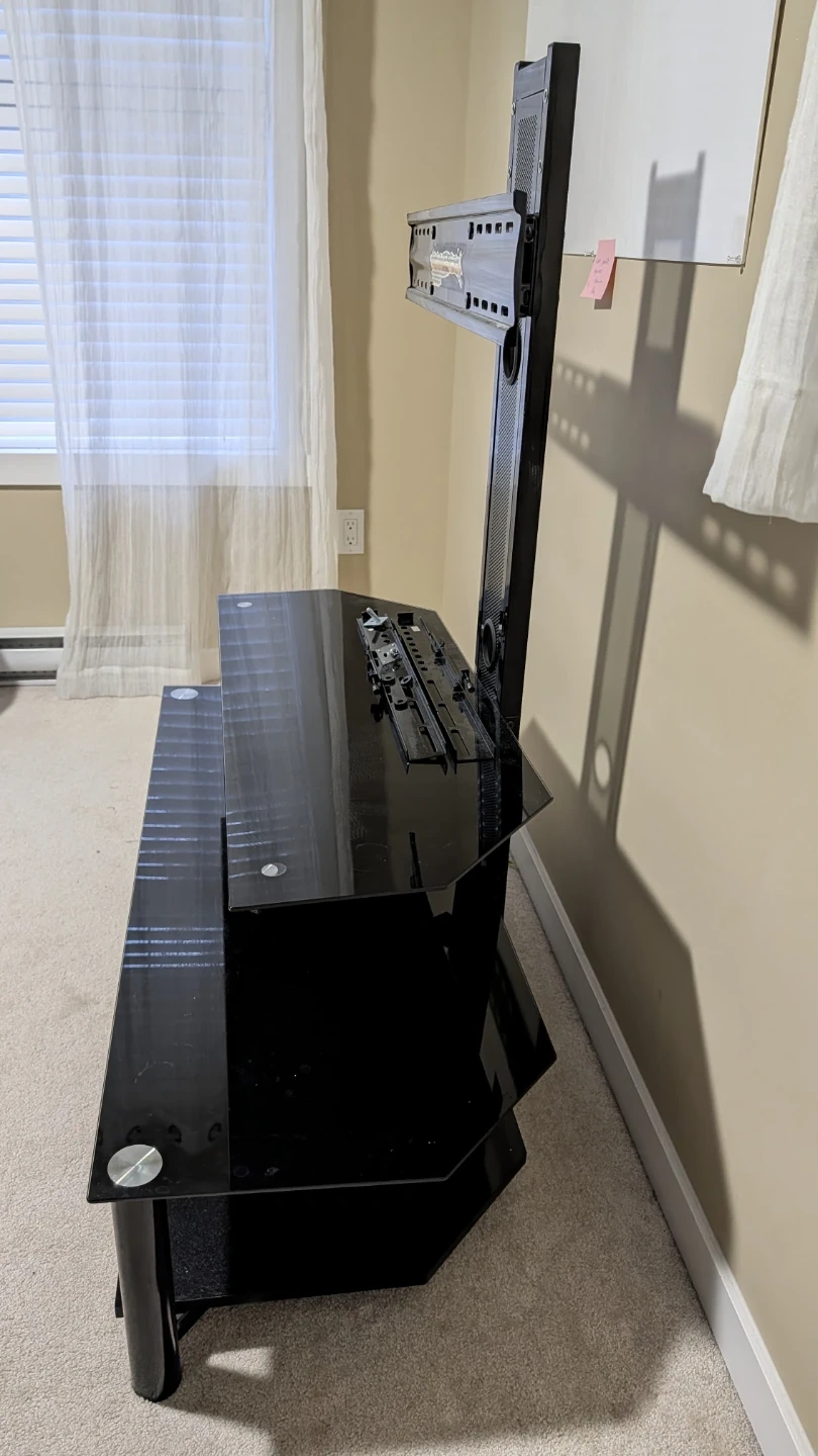 Selling a black glass TV stand. It's in great shape and ready for a new home theatre setup! The stand has multiple tiers for your components and a mount for your TV.