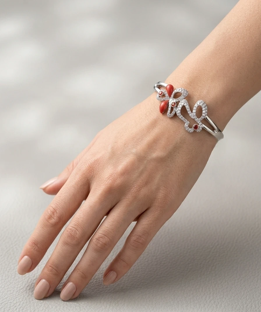 Beautiful Swarovski crystal bangle bracelet with a butterfly design. It features a silver-tone metal band adorned with clear crystals and coral-coloured accents. This piece comes with its original Swarovski box.