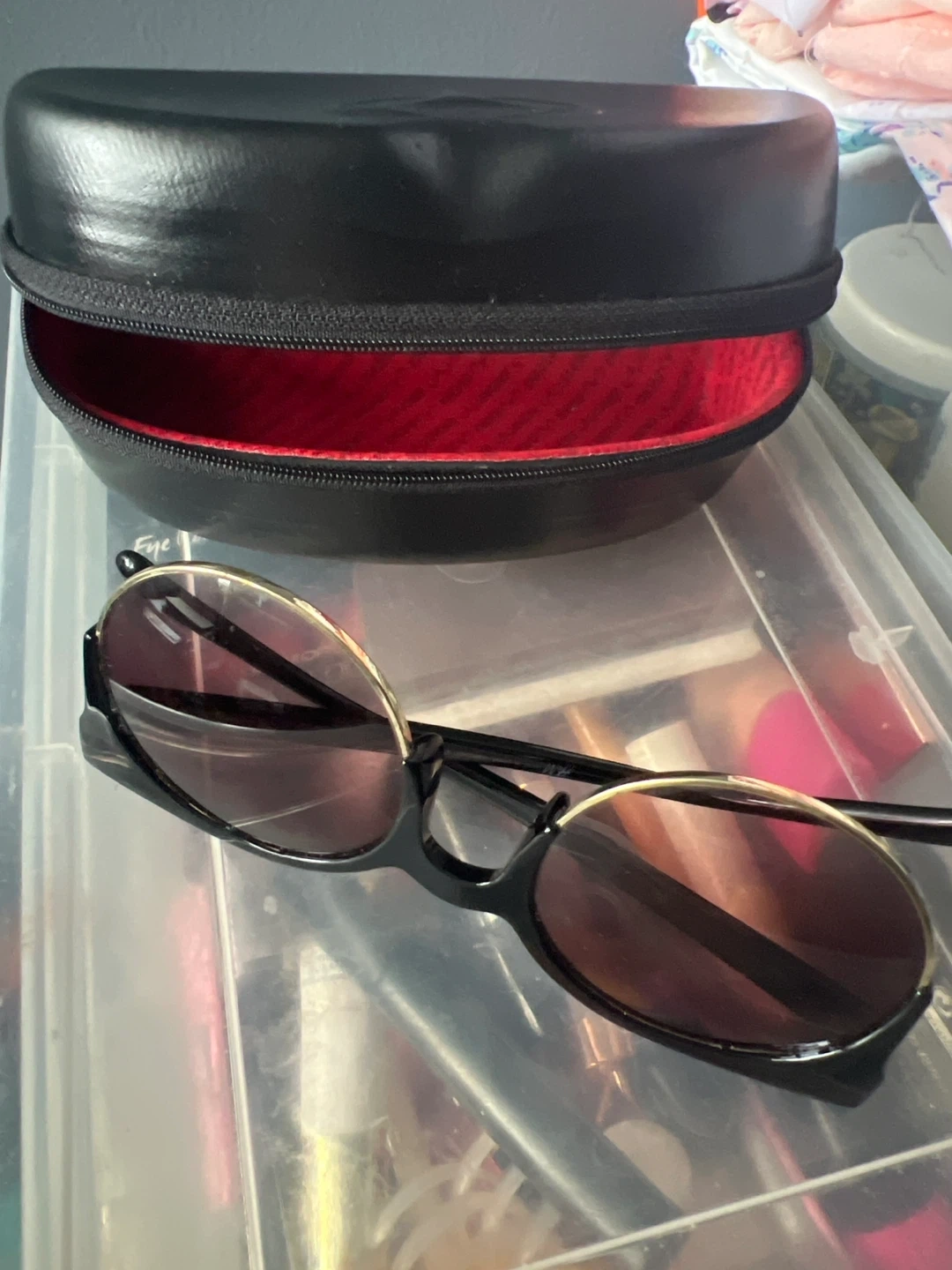 Black and gold oval sunglasses with brown tinted lenses. Comes with a black protective carrying case with a red interior. These shades offer a stylish look for everyday wear.