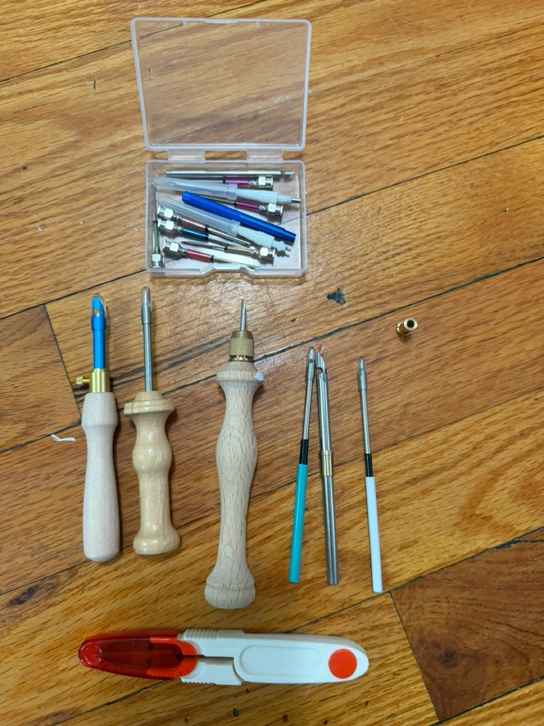 This set includes multiple punch needle tools with wooden handles and a variety of interchangeable needles in a clear case. Also comes with a small thread cutter. Great for various craft projects!