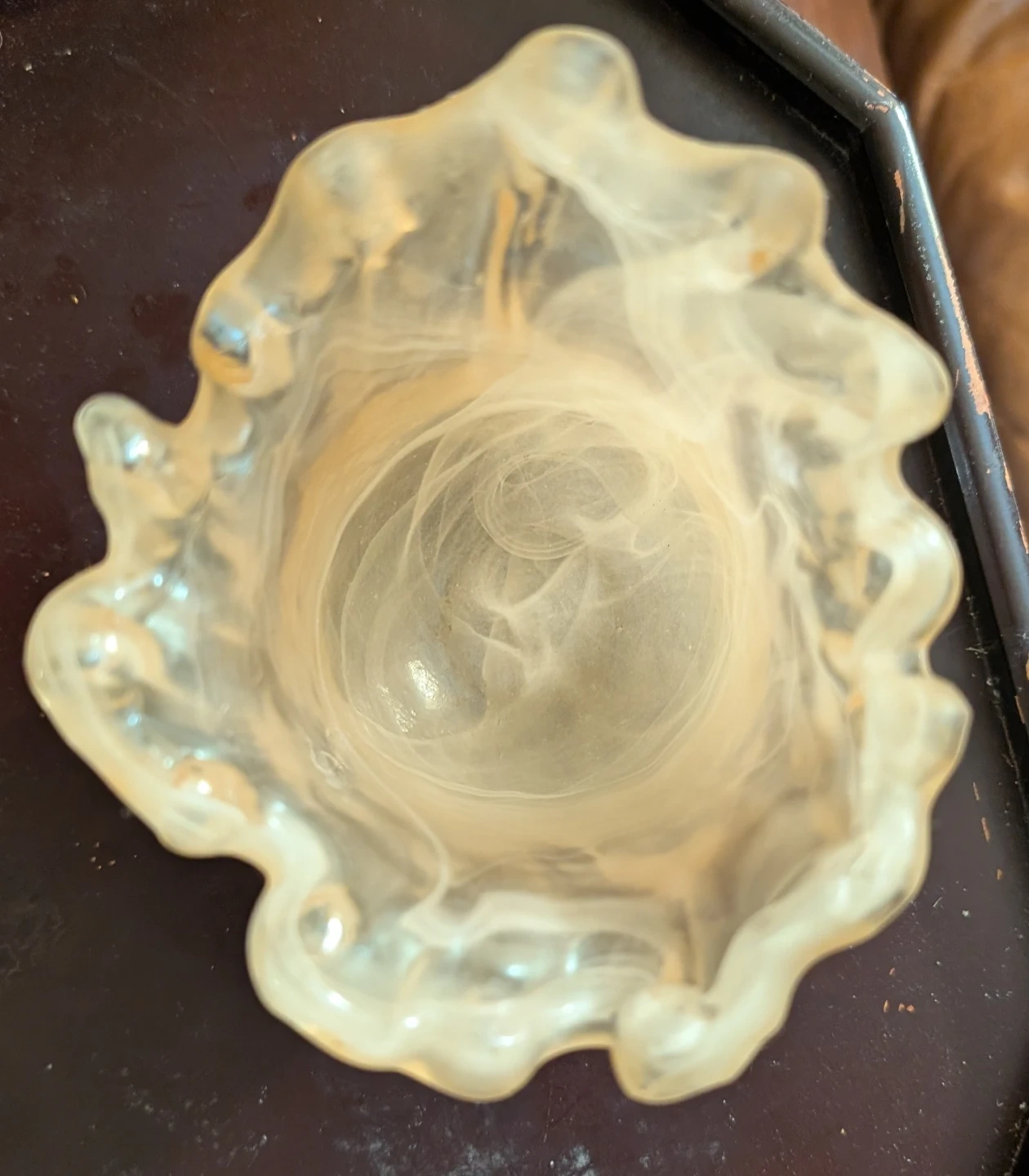 This is a decorative swirled glass dish. It has a wavy, ruffled edge. It's suitable for holding small items like jewelry or keys.