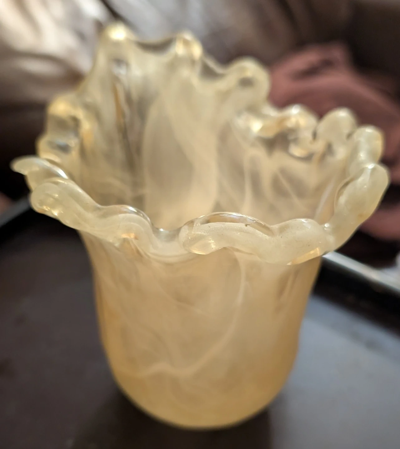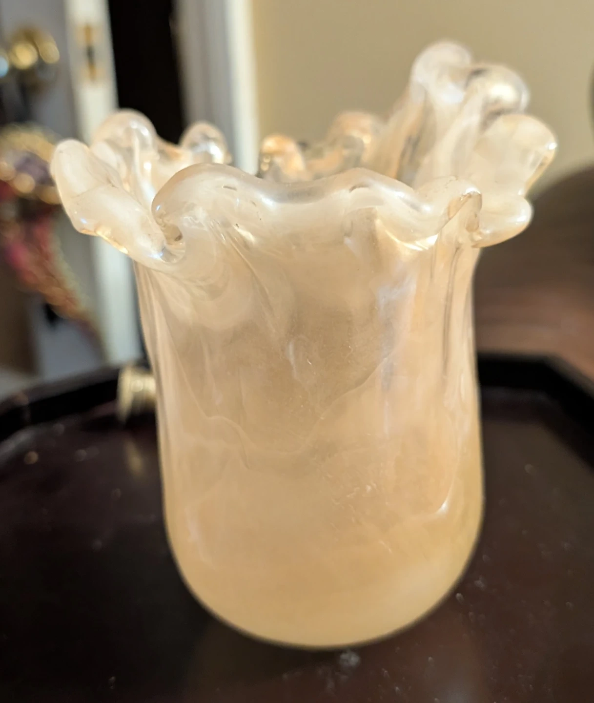 This is a decorative swirled glass dish. It has a wavy, ruffled edge. It's suitable for holding small items like jewelry or keys.