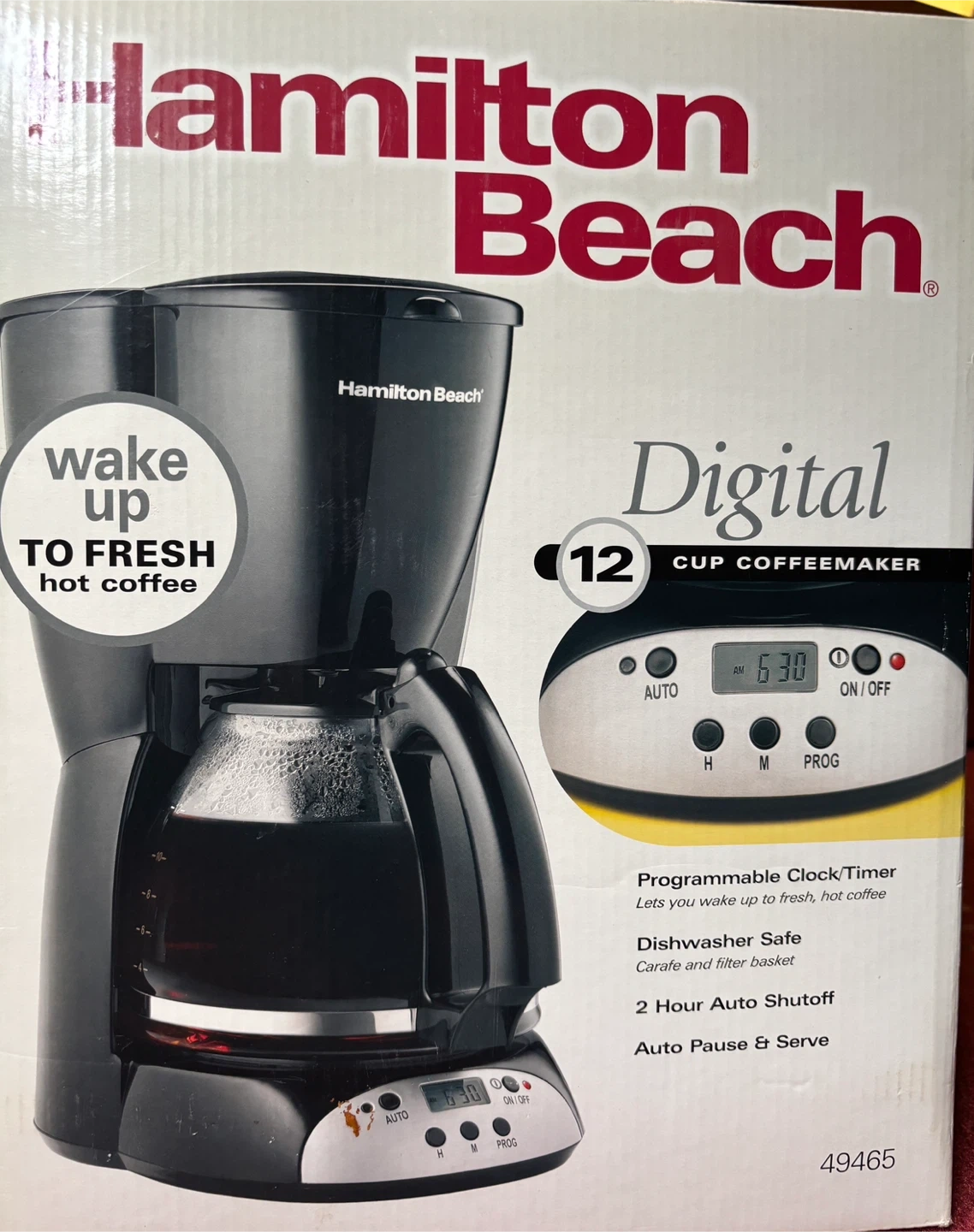 This is a Hamilton Beach 12-cup digital coffeemaker with a programmable clock/timer. It's dishwasher safe and has a 2-hour auto shutoff. It also features auto pause & serve!