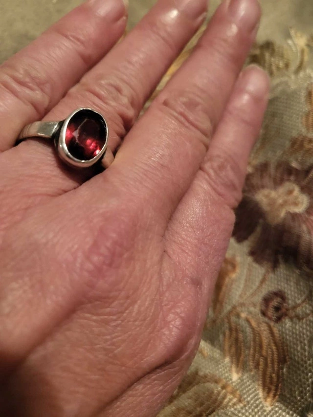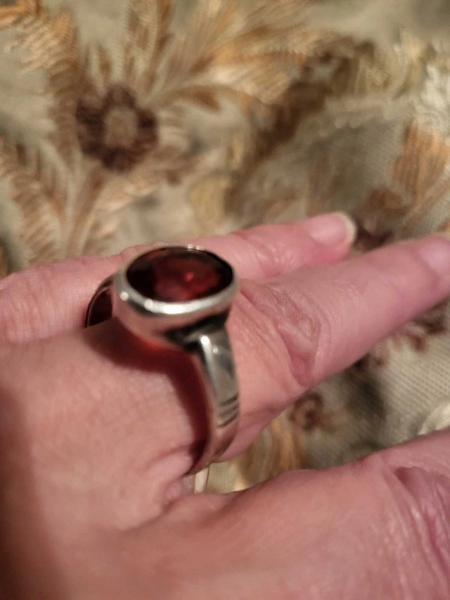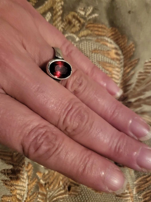 Large oval garnet red stone, size 10, and it is sizeable. I think it is silver but may be white gold, as there is no stamp but it has been sized. This ring is from our family vintage estate. Stunning ring, may be a great deal and treasure. Condition: Used - Like new. For Sale By: Owner.