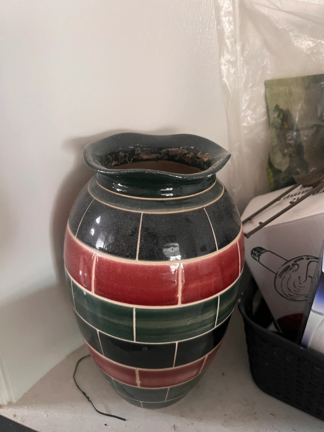 This large ceramic vase features a unique brick-like pattern with red, green, and black sections. It has a wide, fluted opening. It's suitable for displaying flowers or as a standalone decorative piece.
