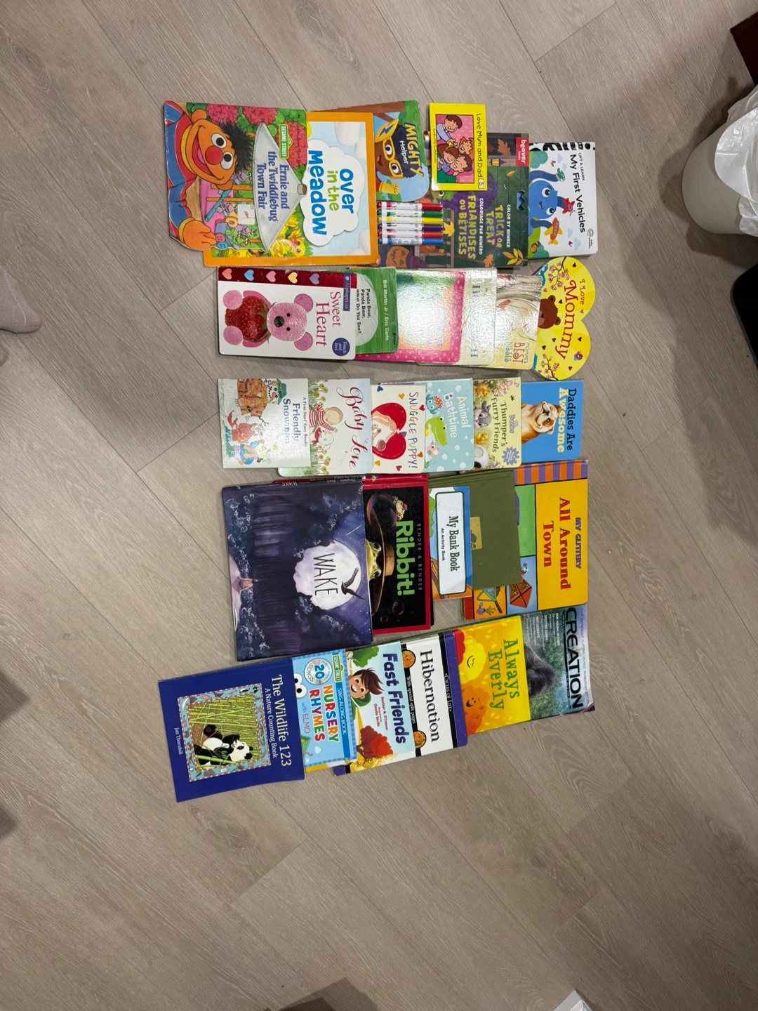 This is a bundle of children's books. Titles include Sesame Street, 'Over in the Meadow', 'Sweet Heart', and others. Books cover various themes like animals, counting, and bedtime stories.