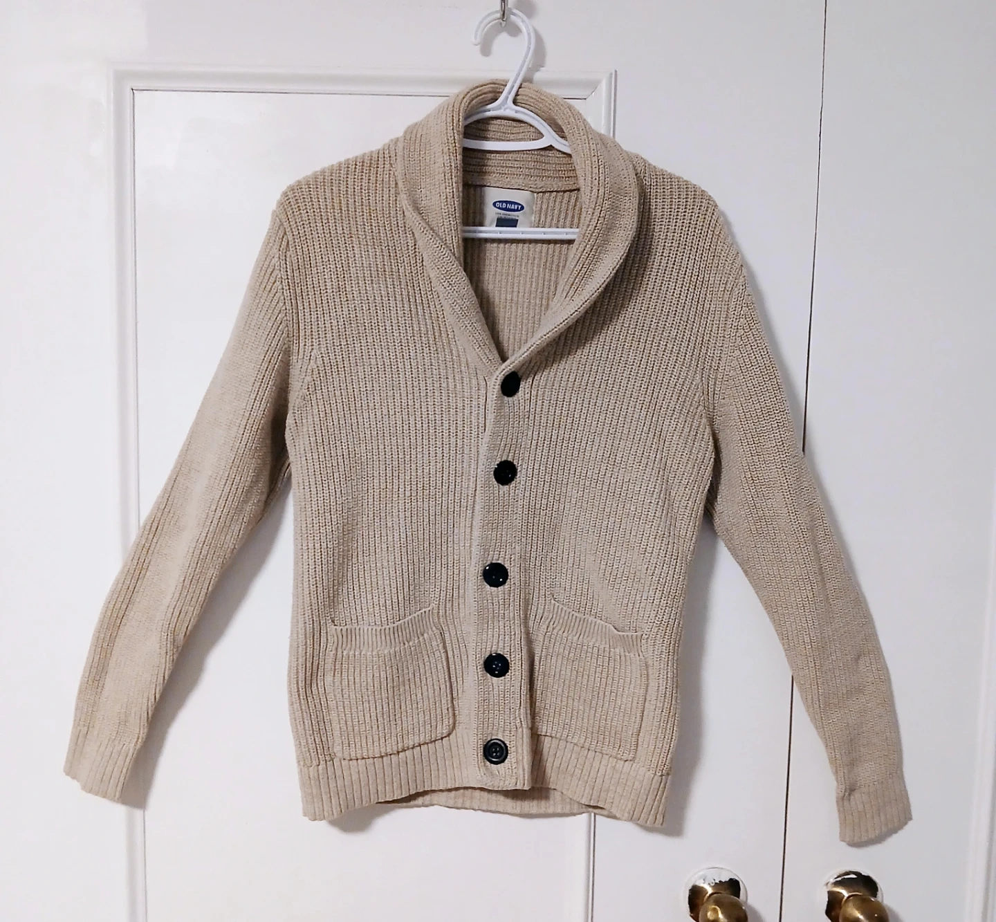 An Old Navy shawl collar beige cardigan. 100% cotton. Size Medium. Available for pick up in Meadowvale area, closest intersection Brittania and Glen Erin