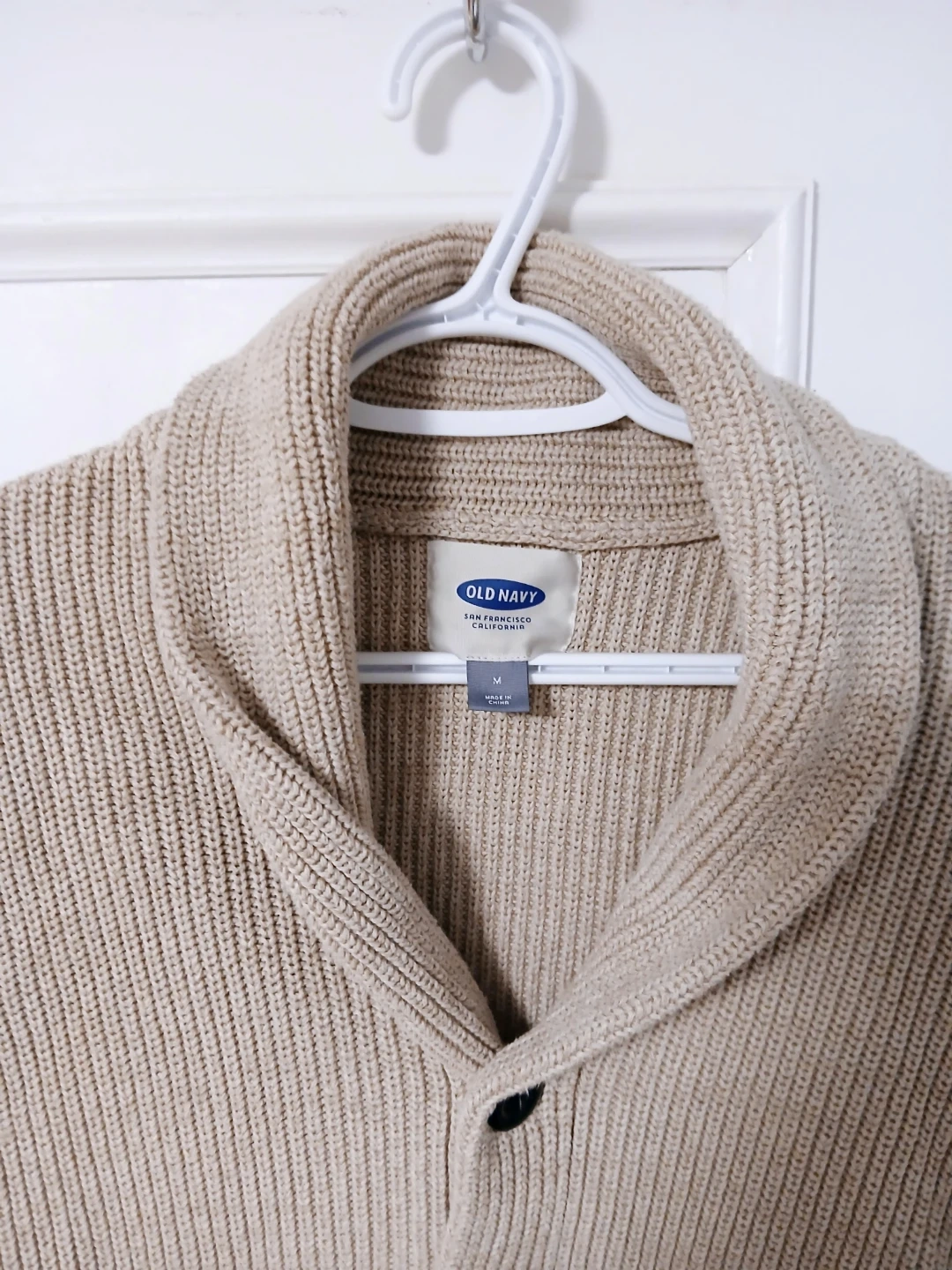 An Old Navy shawl collar beige cardigan. 100% cotton. Size Medium. Available for pick up in Meadowvale area, closest intersection Brittania and Glen Erin