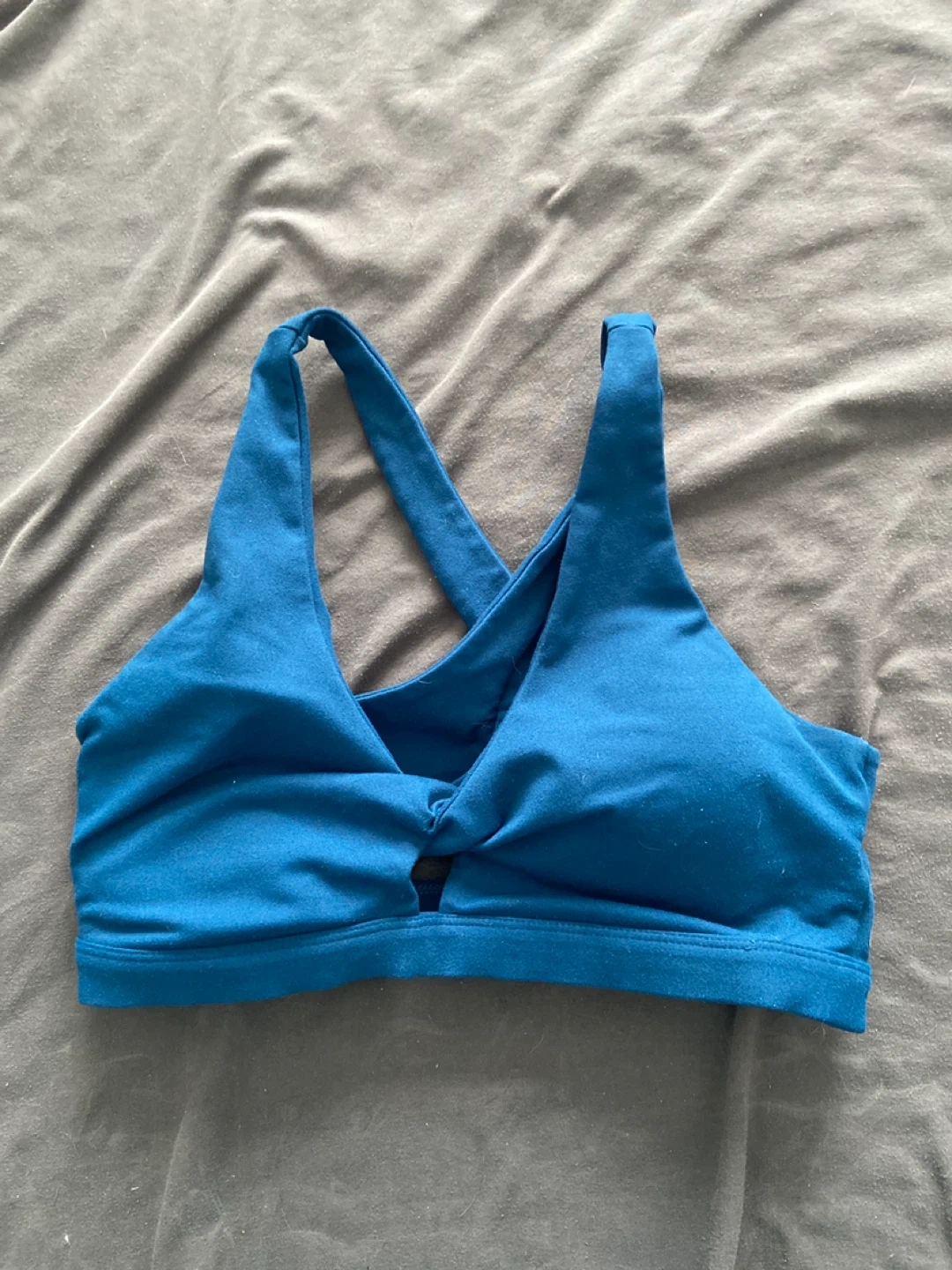 This Fabletics sports bra is a lovely shade of blue. It features a stylish criss-cross back design and a comfortable band. Made with flexible material for active wear.