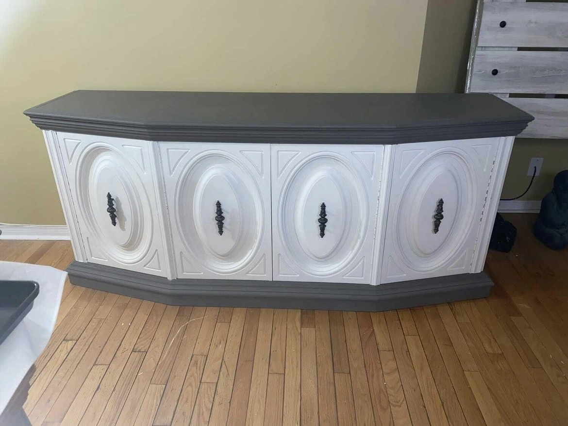 Four doors, one drawer. The doors have a curved shape and the top has an oval shape. The interior has a shelf in each cabinet and one felt-lined drawer with dividers. It is in good used condition. The piece is well-made and strong.