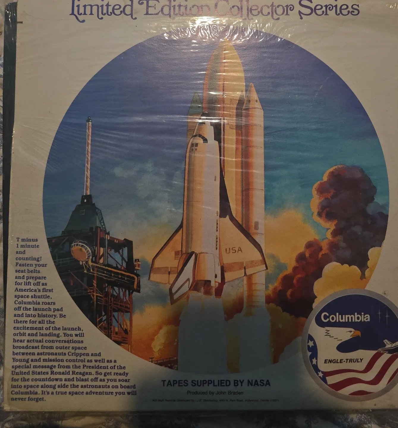 This is a Columbia Limited Edition Collector Series record featuring the launch of the space shuttle Columbia. It includes actual conversations from outer space and a special message from President Ronald Reagan.