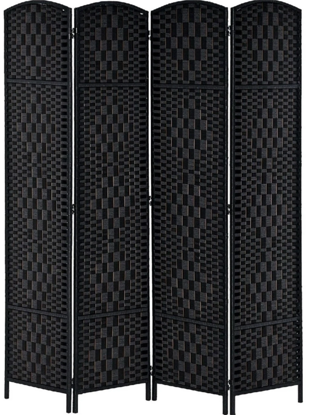 This is a black, 4-panel room divider screen with a woven design. It's 70.9 inches tall and each panel is 17.7 inches wide. The frame is black. This divider's a handy way to create privacy or separate spaces!