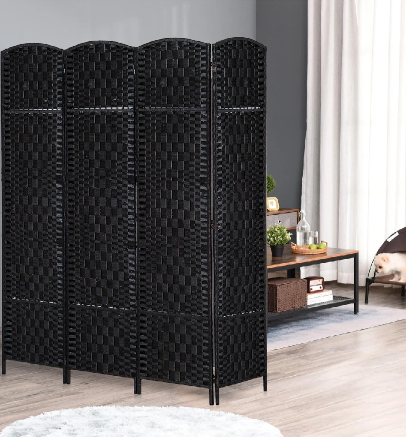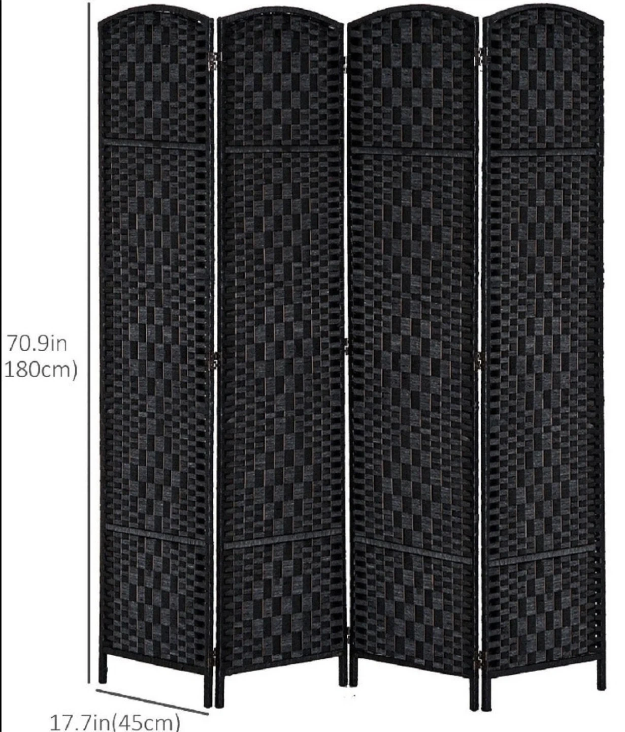 This is a black, 4-panel room divider screen with a woven design. It's 70.9 inches tall and each panel is 17.7 inches wide. The frame is black. This divider's a handy way to create privacy or separate spaces!