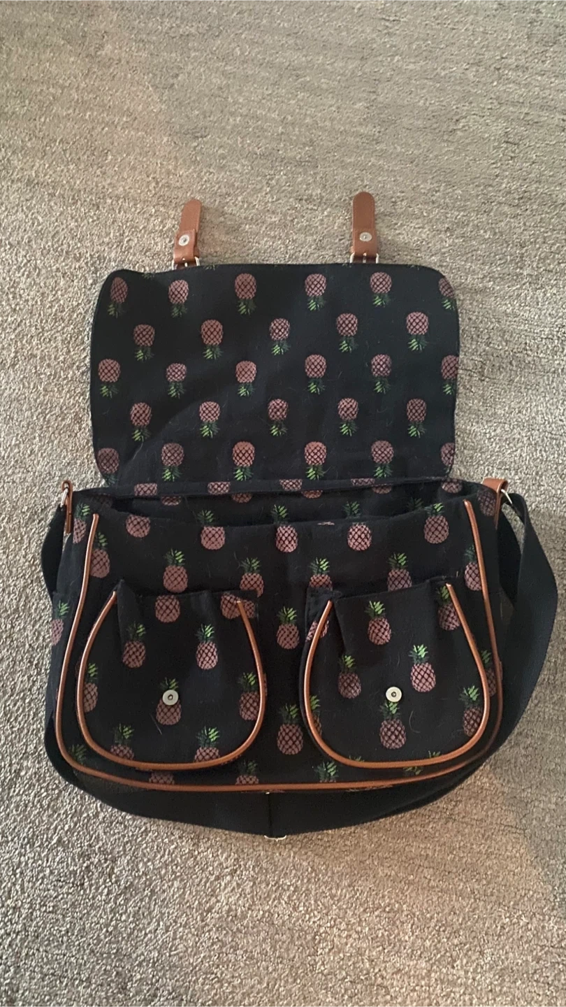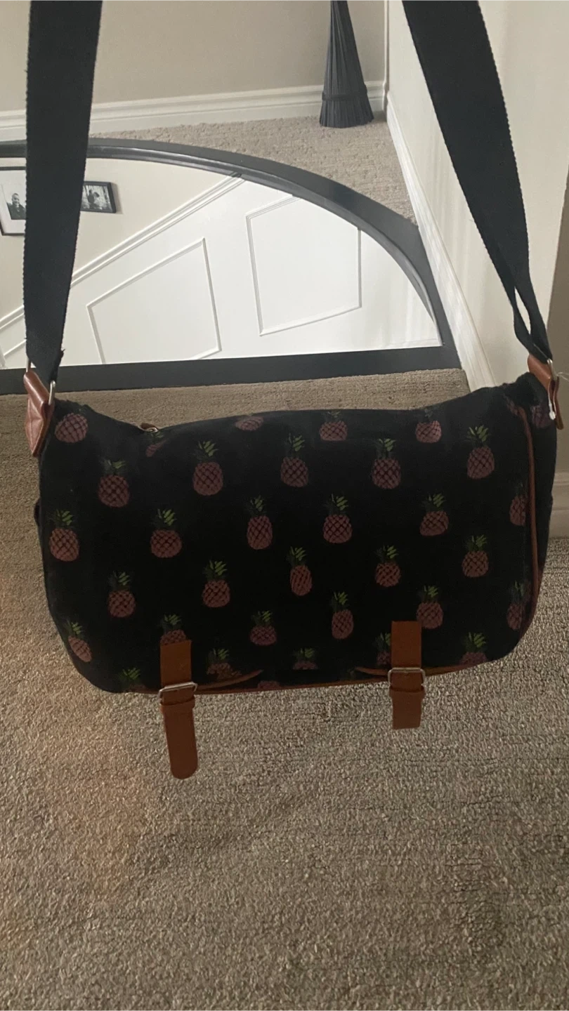 Cute black messenger bag with a repeating pineapple print. It's got a spacious interior and buckle closures. Material looks like canvas with faux leather trim.